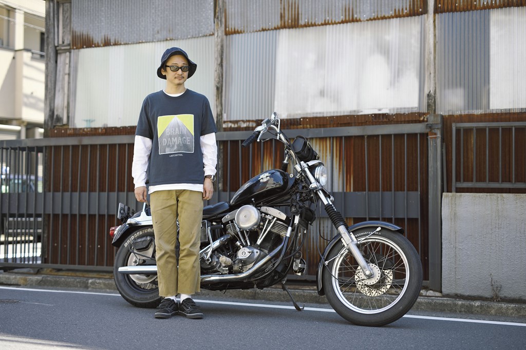 FXのスタイリッシュなフォルムを崩さずに、フロントフォークを4インチ伸ばし、’76年のアニバーサリータンクは取り付け位置を変更してやや上向きになるように装着。あえて’70年代の野暮ったい雰囲気を残して、街乗りにもロングツーリングにも対応する大人のカスタムに仕上げられた。ロンTとTシャツをレイヤードにしたストリートスタイルは、足元もスニーカーでゆるカッコよい着こなしに。