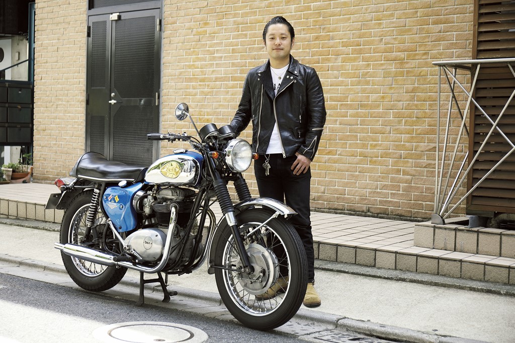 ルイスレザーズの店長に影響されてBSAを手に入れたという池野さん。購入時はスクランブラー寄りのカスタムが施されていた車体を純正のスタイルに戻しているところだと言う。ルイスレザーズのライダースはクロームメッキタンクを装備した上品なブリティッシュバイクがよく似合う。春夏も革ジャンでバイク、これぞバイク乗り。