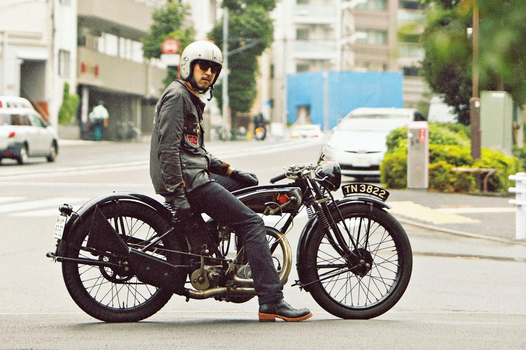 英国車が世界のバイクシーンを牽引していた’40年代以前の車両を好む石嶋さんが愛用しているのは現存数がかなり少なく知る人ぞ知るREX-ACME。軽量な車体にパワフルなブラックバーン社製の350㏄エンジンを搭載した乗り味は、現代車にはない操作性を含め、短い距離でも十分楽しめる車両なのだとか。通年着られるワックスコットンのジャケットも車両の雰囲気にマッチしている。