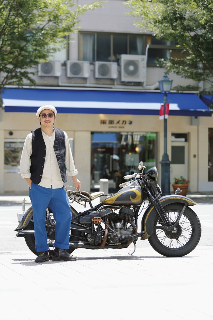 セレクトショップ「ノーネーム」の代表である古俵さんのWLは、パーツは当時モノで時代感を合わせているが、ペイントは車両の年代に合わせてヴィンテージ感のある塗装をアリゾナワークスで施した。フロントフェンダーにあしらわれたオーナメントは、’40年代に実在したキャラクターをサンプリングしたショップのオリジナルマスコット。シャツにベスト、カラーパンツで街乗りにぴったり。