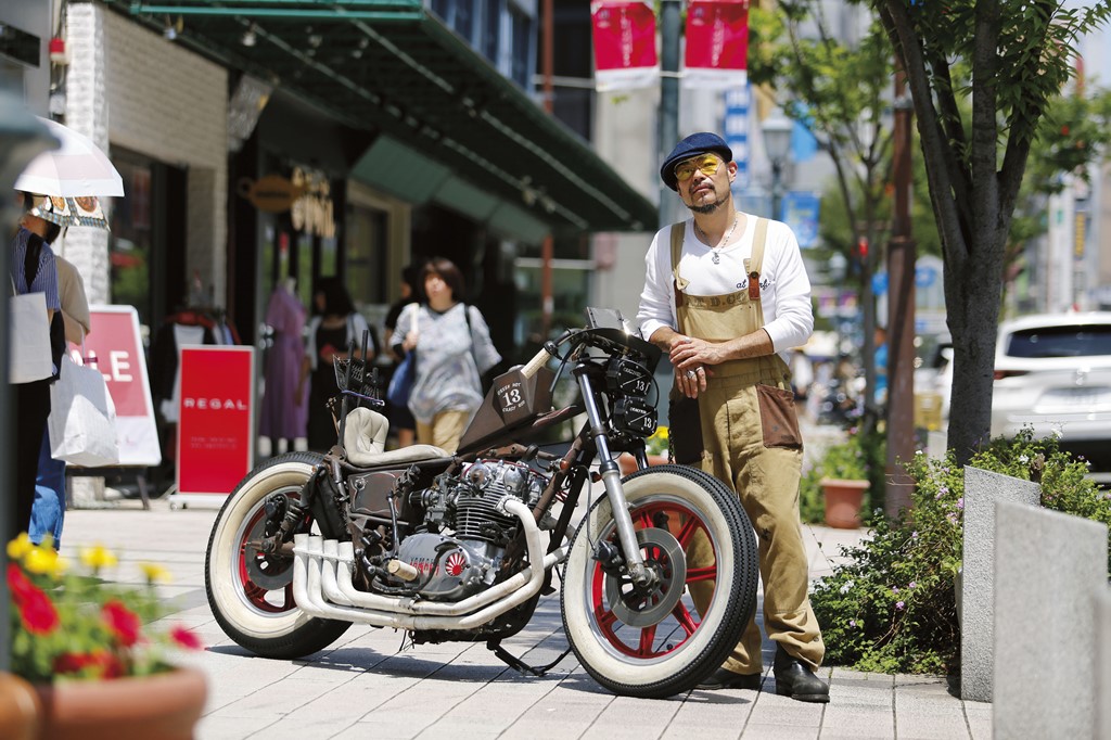 ラットロッドのイメージでギュッとコンパクトにカスタムした個性的なXSチョッパーは、自分でカスタムしたという力作。車両と同系色のオーバーオールを主役にしたコーディネイトも好印象でスタイルのある雰囲気に。