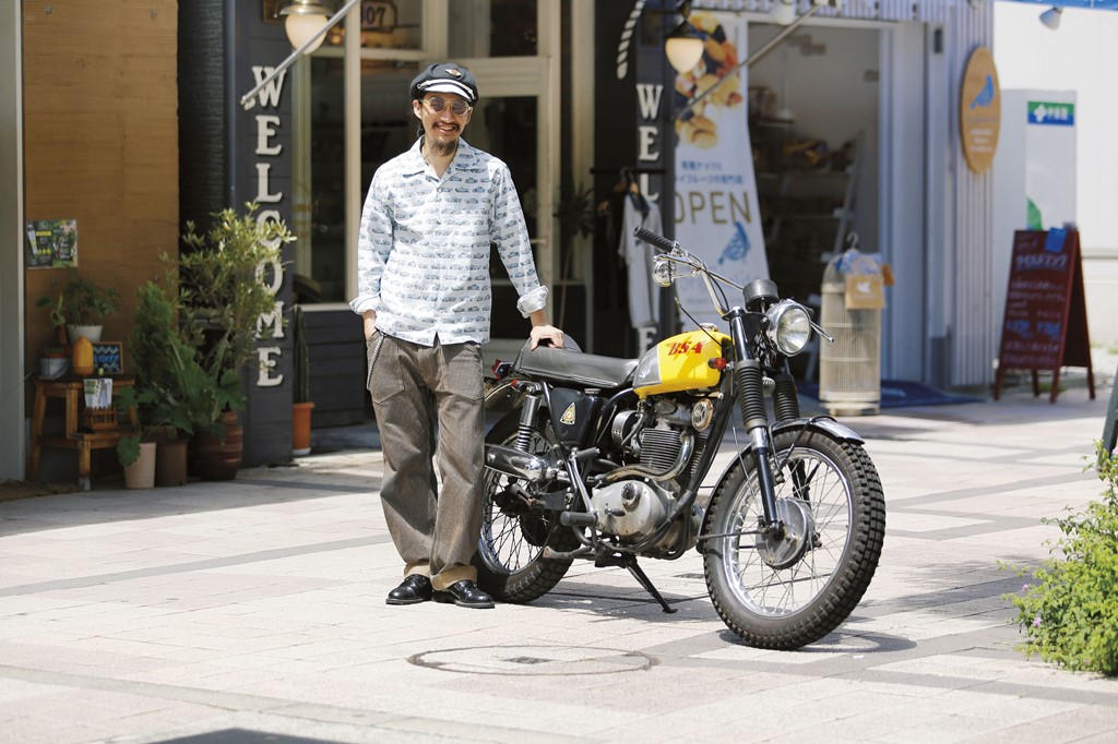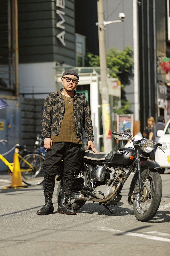 ノーマルであるスクランブラースタイルをキープし続けて丁寧に乗っているHIROさん。今年らしい開襟シャツやバイカーズキャップなどアットダーティのアイテムで構築したコーディネイトでこなれ感のある仕上がりに。