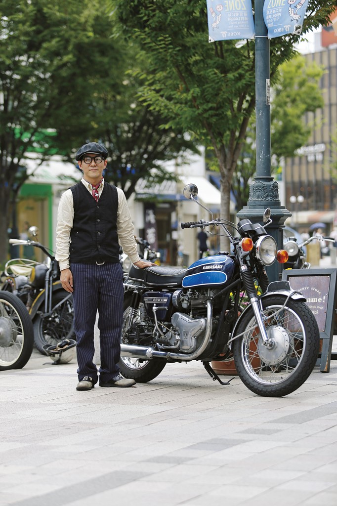 以前はトライアンフに乗り、現在はW1とバーチカルツイン党の戸倉さん。フルノーマルでもサマになるのは旧車ならではの楽しみ方の一つ。スカーフやベストなどクラシカルなスタイルも違和感なく車両にマッチ。