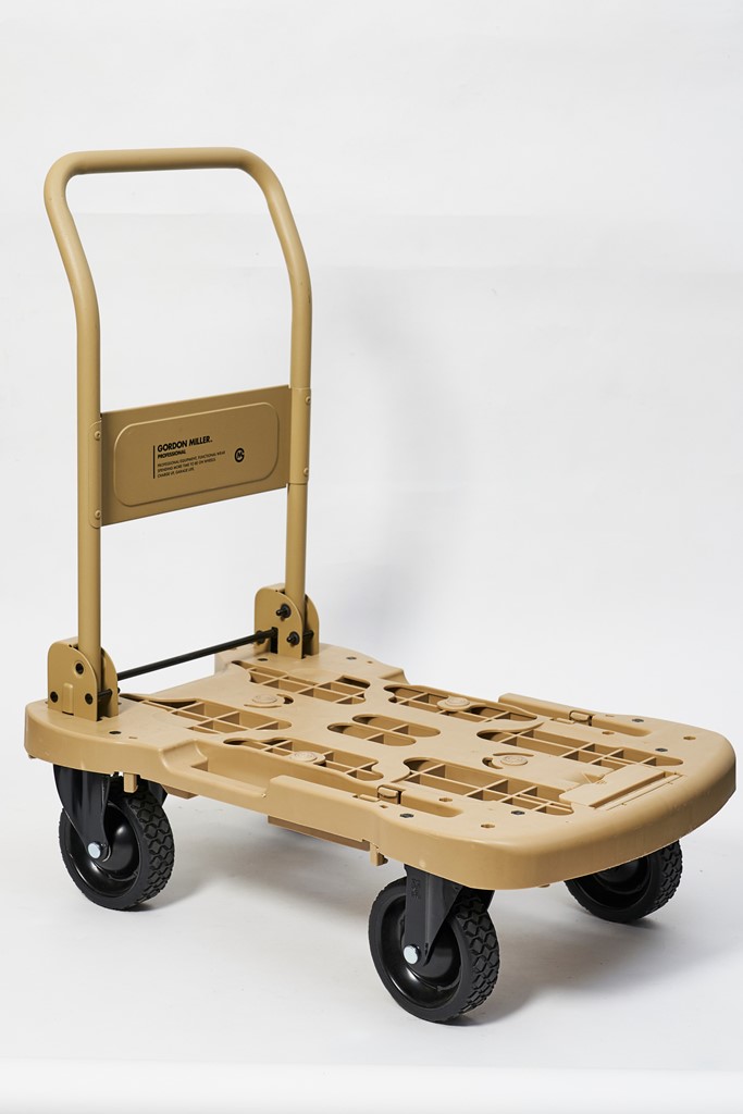 ガレージユースやカーライフを前提とした機能的なデザインのウエアやギアを提案しているゴードンミラー。この台車は直径約15cmの大径タイヤで、オフロードでも走行できるタフな仕様。荷台部分は格子状になっていて、積載物の固定用にゴムロープを掛けられたり、積載物の前方へのズレを防止するストッパーが装備されているなど、抜群の機能性を持っている。