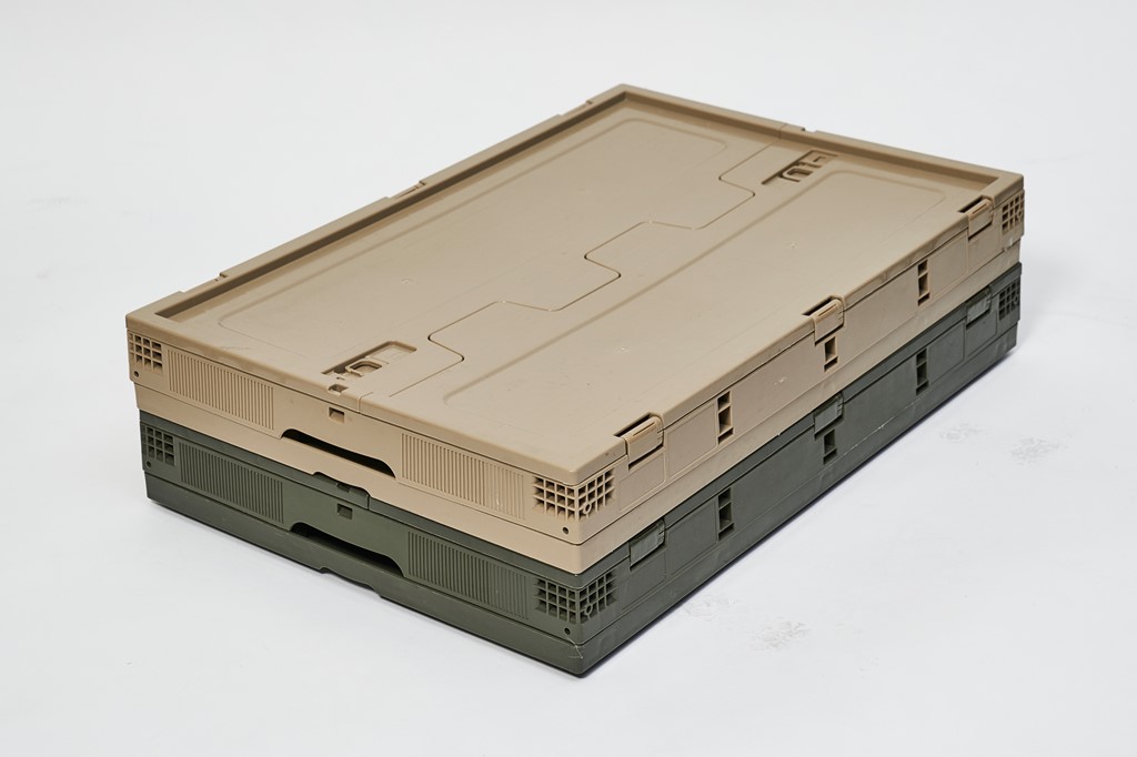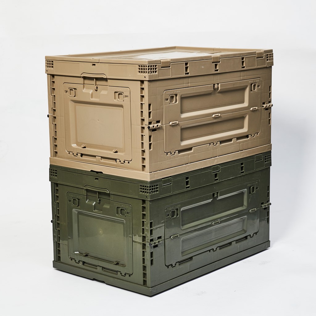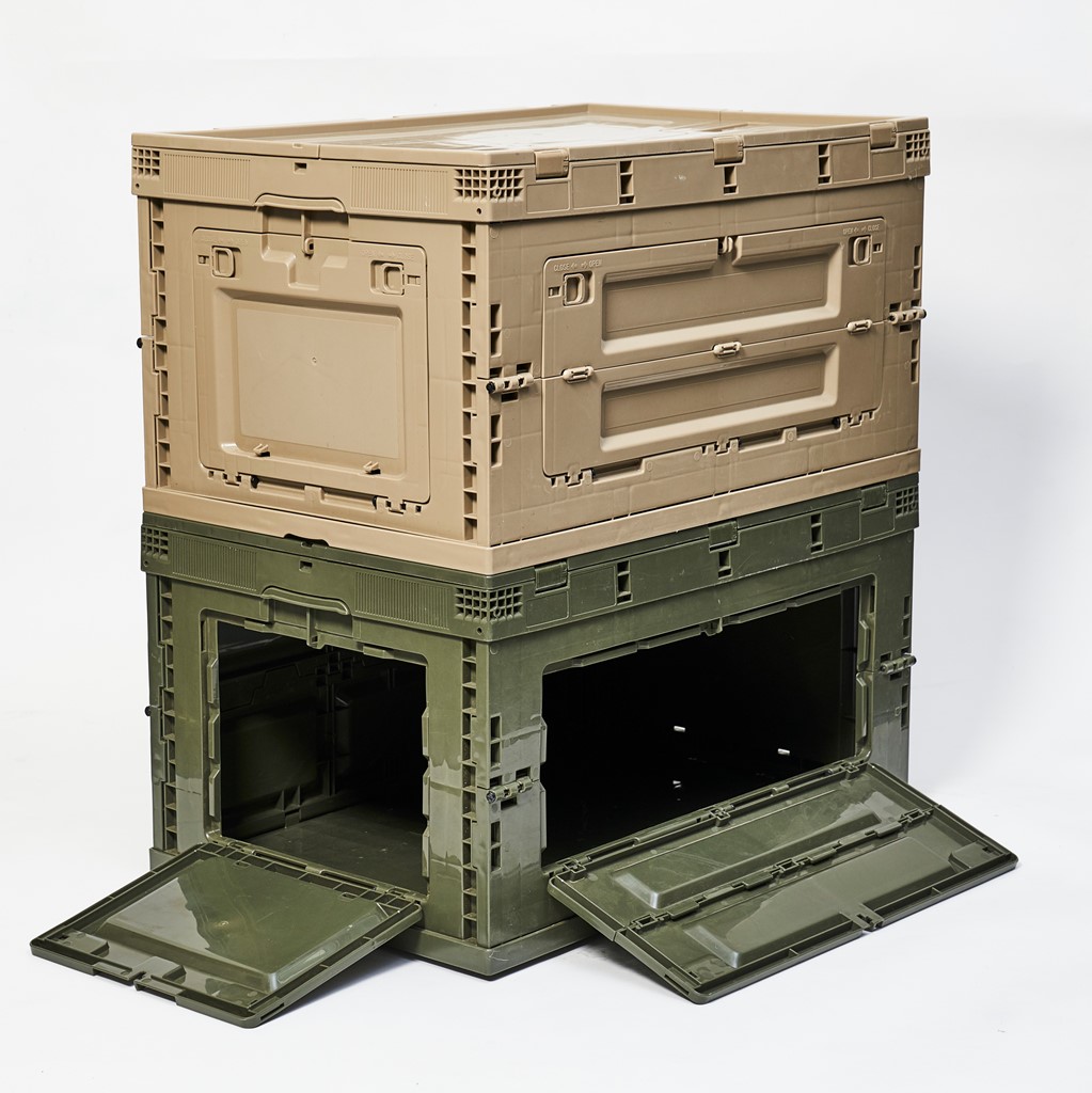 使用時は大容量、使わないときは薄く折りたためるミリタリーテイストのコンテナ。蓋付きでホコリの多い場所でも気にせず使え、蓋をロックすることも可能だ。またサイドに開け閉めできるドアが付いており、積み重ねた状態でも中身を出し入れできるのもポイントが高い。アウトドアなどのギアをこの中に入れておいて、使うときにシェルフごとクルマに積み込めるぞ。50ℓと80ℓの2タイプをあり。