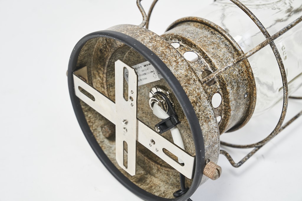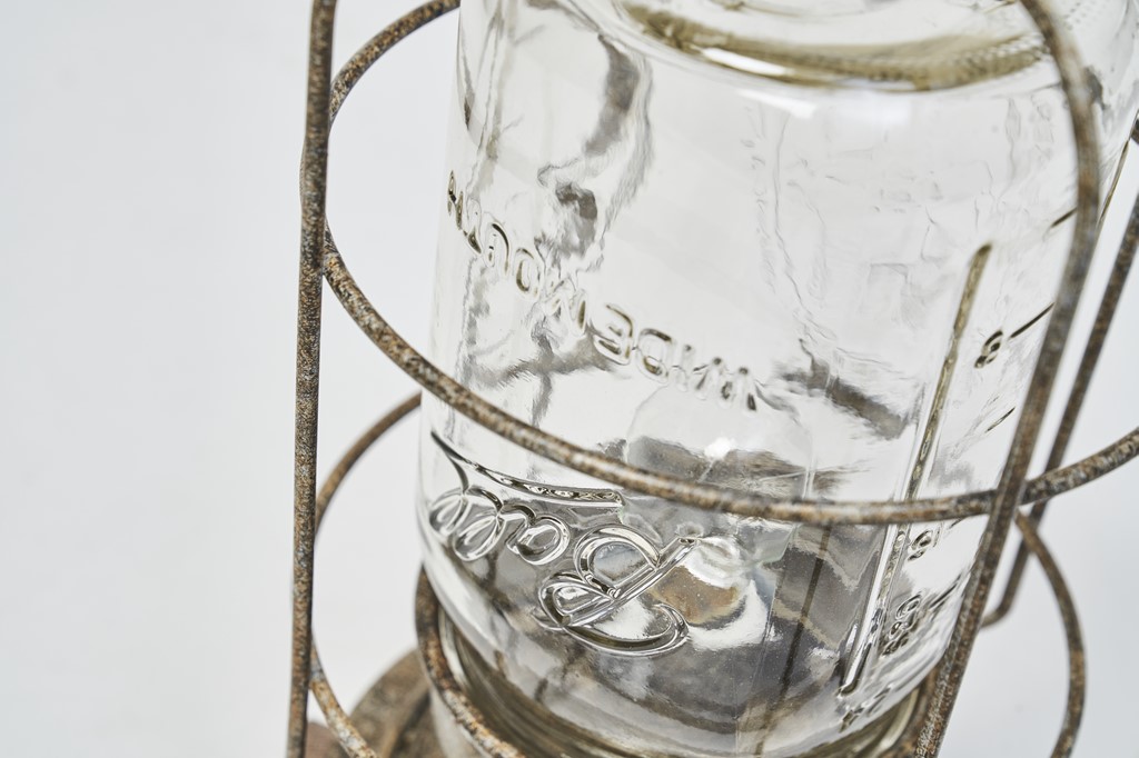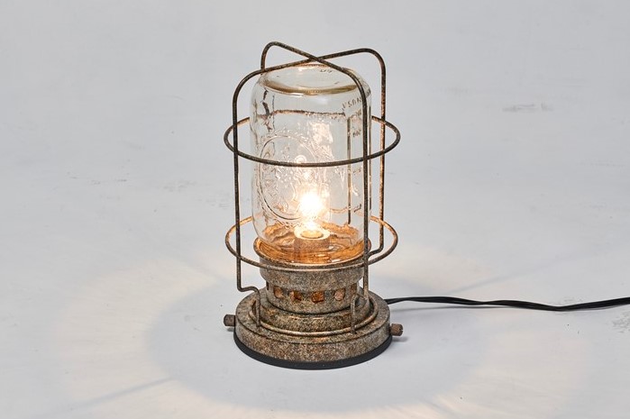 お馴染みのボールのメイソンジャーを使ったランプ。スチール製のベースを使い込んだような雰囲気にするために、塗装のムラやカケ、擦れなどのエイジング加工を施している。写真のように普通に置いてデスクランプにもなるが、壁掛けランプとしても使えるのも嬉しい。メイソンジャーの口径はワイドマウスタイプを採用。カバーを外して同じ口径のボトルと交換することも可能だ。