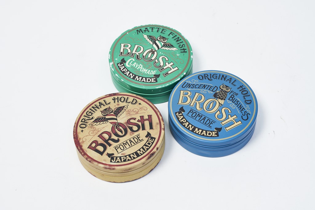 昔から使わせている整髪料といえばポマード。ブロッシュは日本人の髪質でもしっかりセットするホールド力が魅力。シーンに合わせて使い分けたいラインナップ。