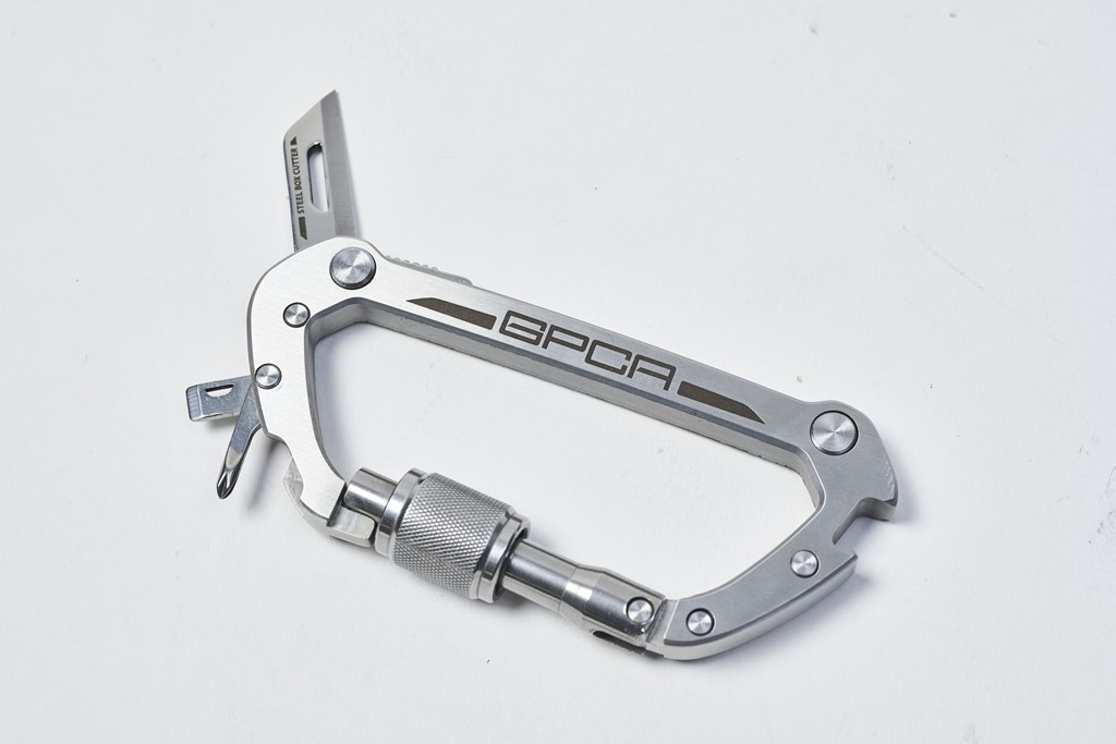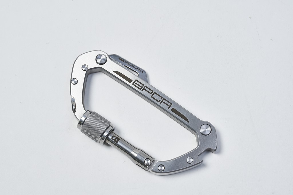 8つのツールを凝縮させたカラビナ。ステンレス製で、コンパクトなボディにカッターや栓抜き、ドライバーなどの機能が備わっている。ベルトループに引っ掛けて携帯できるのも◎。