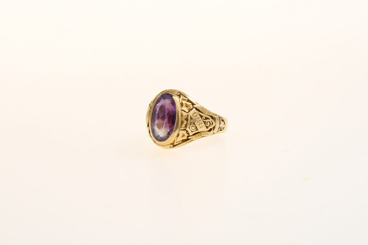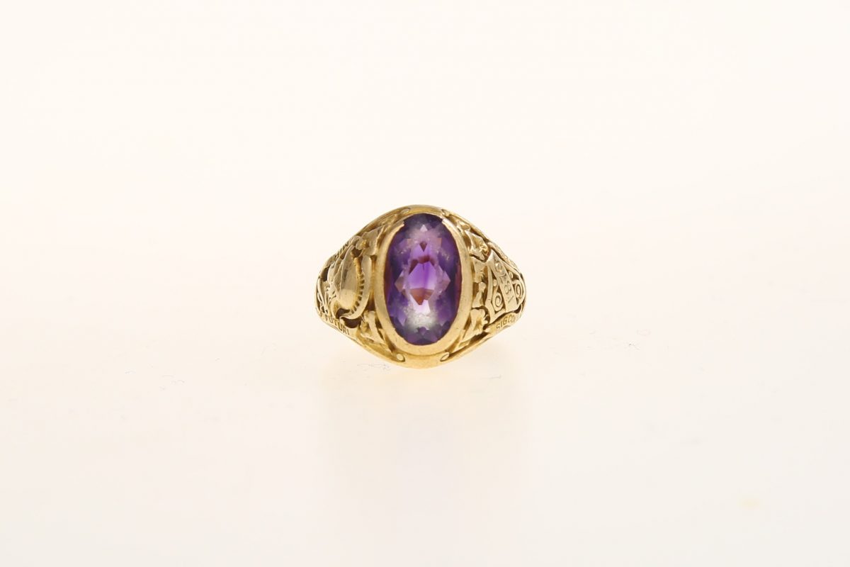 1870年に創立したニューヨーク州立大学ハンター校のもの。おそらく1920年代製。14k無垢でスクールカラーと同じ色のアメジストが鎮座する。28万4900円(ARKnets)