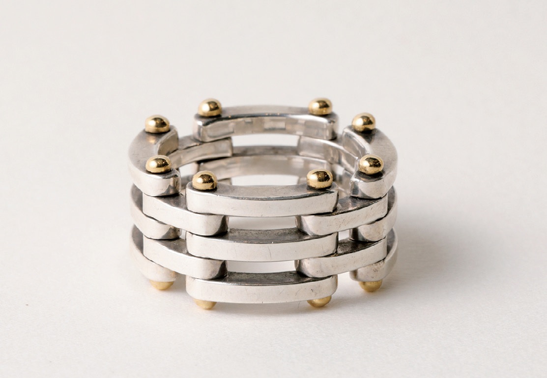 シルバーとゴールドを組み合わせたリングは、パーツが稼働するギミックに富んだ作り。大振りなサイズ感であるが、上品なデザインなので、身に付けると馴染んでくれる。3万800円
