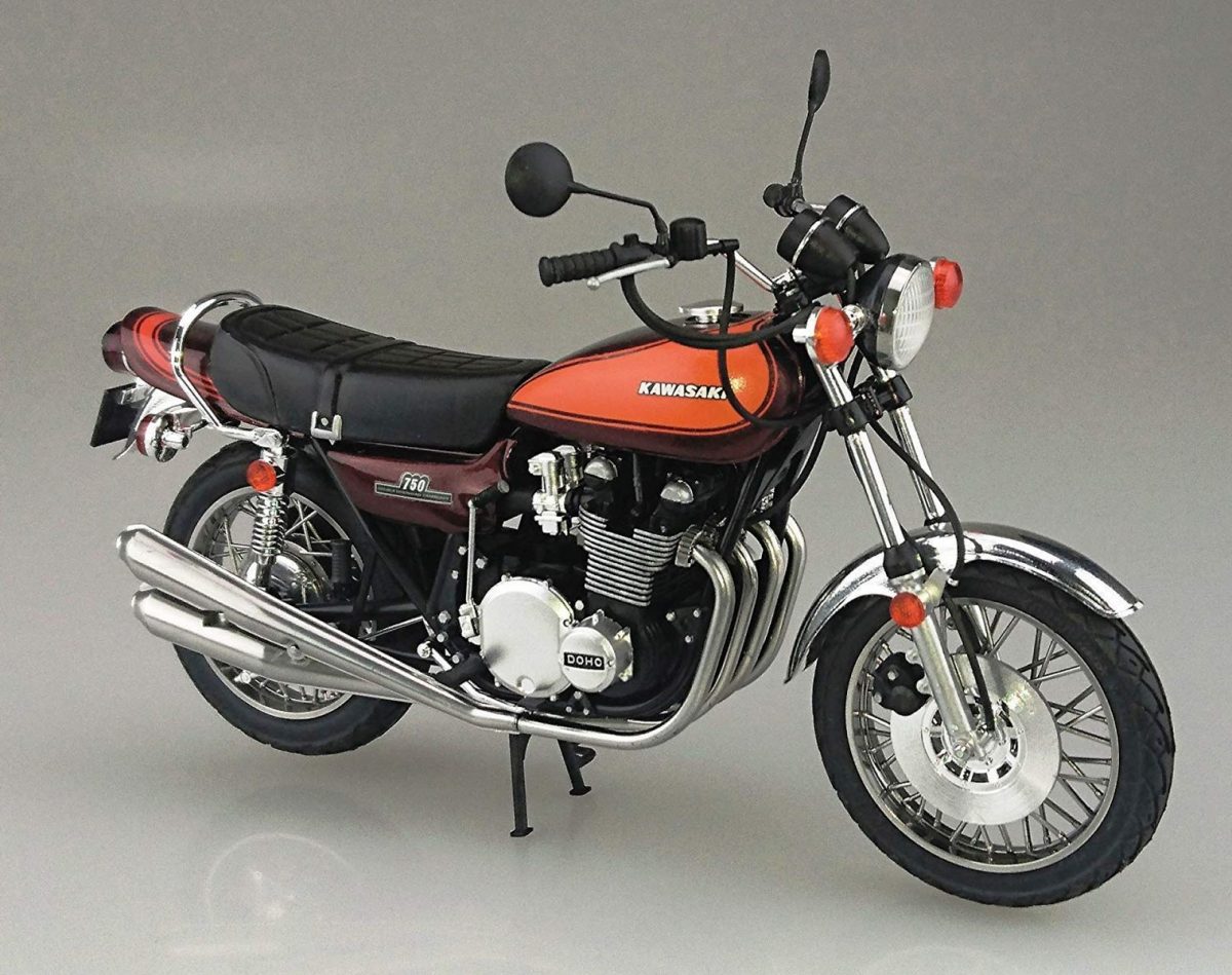 国産絶版バイクのなかでも最高峰ともいえるZII。気がつけば実車はとんでもないプレミア価格になっている高嶺の花。でもプラモデルならなんとかなります。これはプラグコードやブレーキホースなどがビニールパイプで再現されるなど作りもさすが。下手にカスタムせず、この火の玉カラーのまま完成させたい。2200円