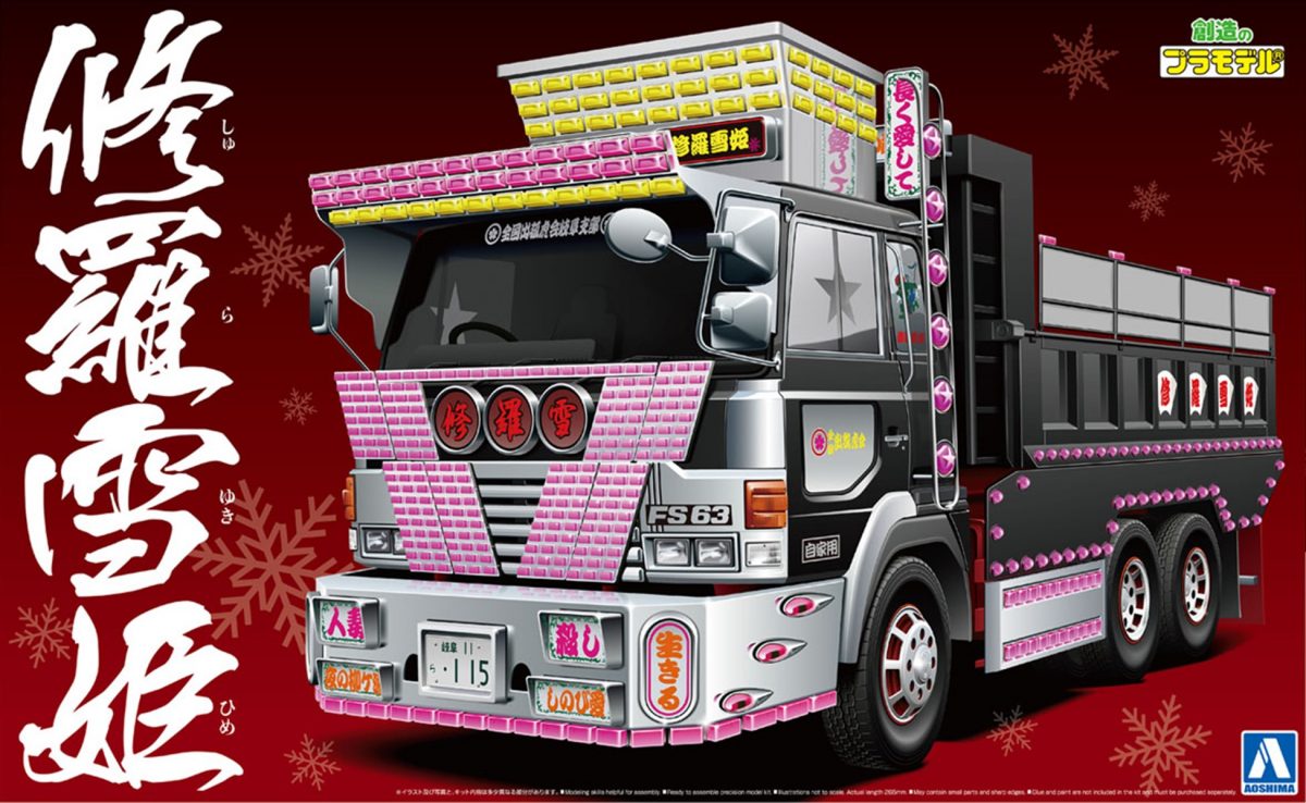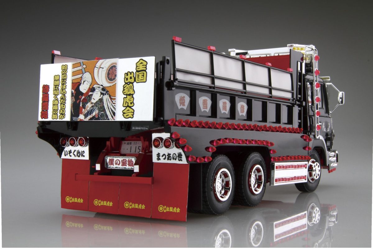 バリューデコトラシリーズは旧きよきデコトラに現代のスパイスを加えたコンセプトで生まれたキット。修羅雪姫(ネーミングがすでにイケてる)はその中でも電飾モリモリのギラギラなスタイルでまさに「ザ・デコトラ」の雰囲気。リアにメッセージが入る「お約束」もしっかりと再現される。6380円(市場在庫のみ)