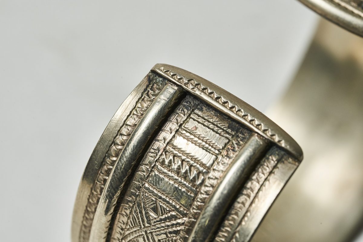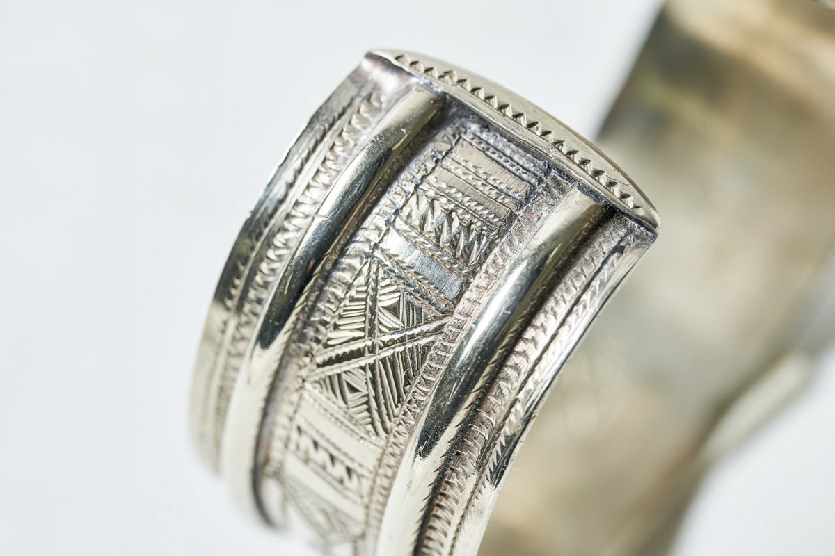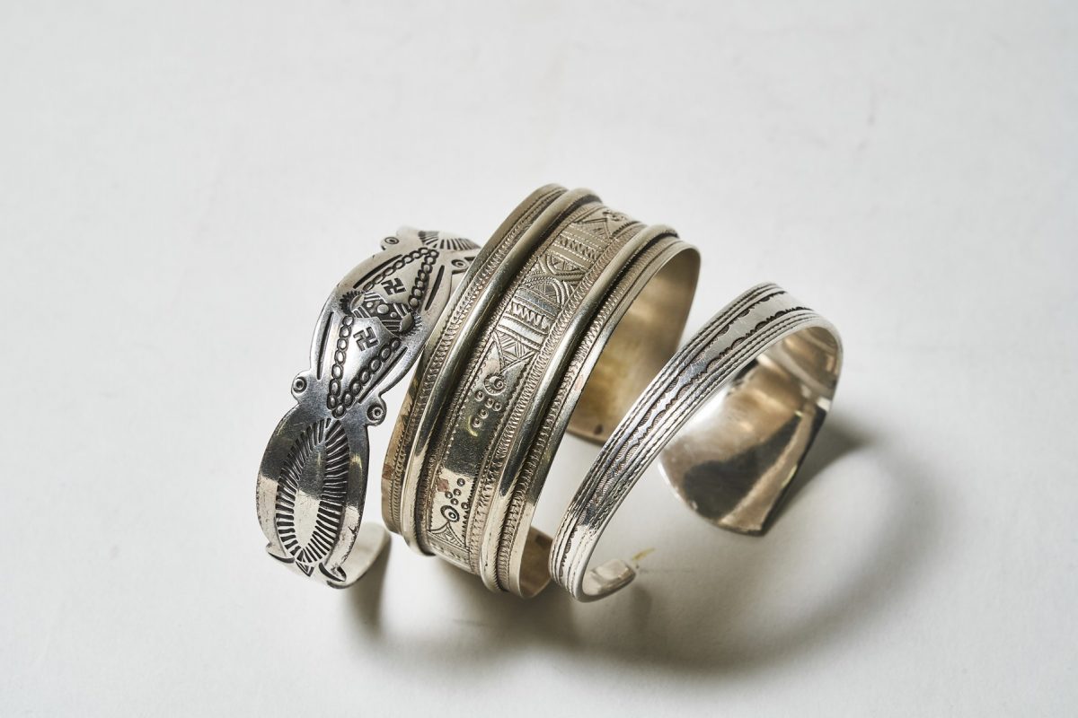 インディアンジュエリーなどに多く見られるバングルは、板状にしたシルバーを曲げて製作される。そんな平たいタイプにはシルバー磨き用のクロスが重宝する。