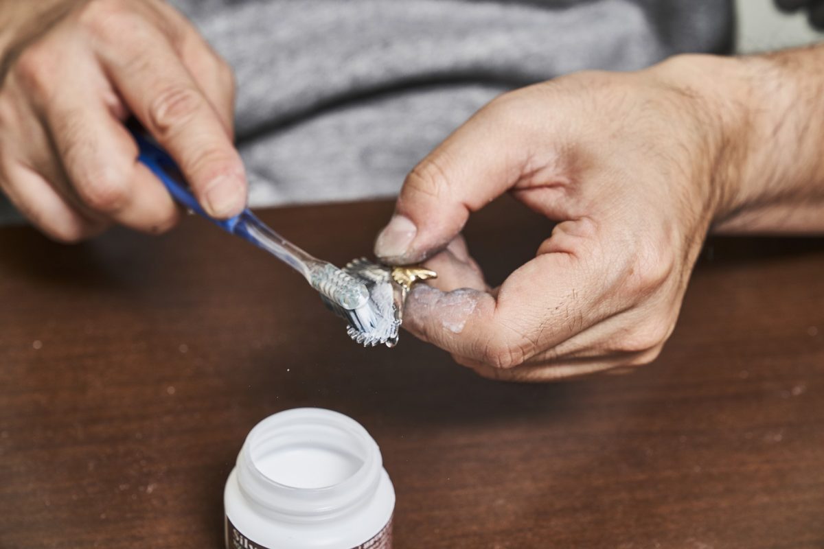 平たい部分はウエスで磨き、細かな羽根部分は歯ブラシを使って磨く。磨き終えたらクリーナーを拭きとり水で洗い流す。