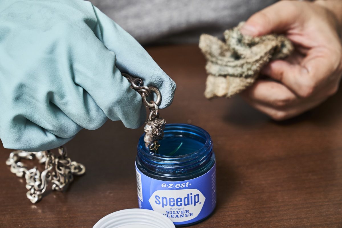 作業手順はシルバー製品をボトルに10秒ほど浸けるだけ。強酸性なのでこぼしたり、肌に付けたりしないよう注意しよう。