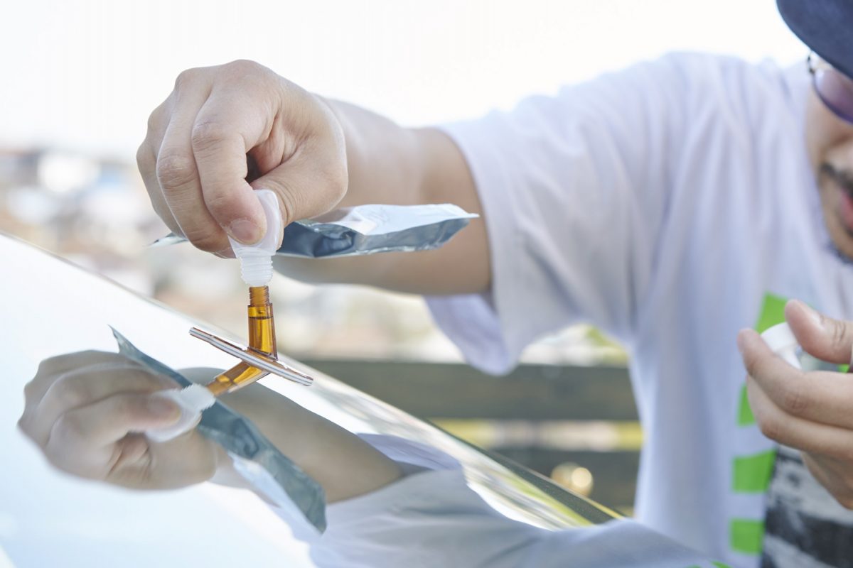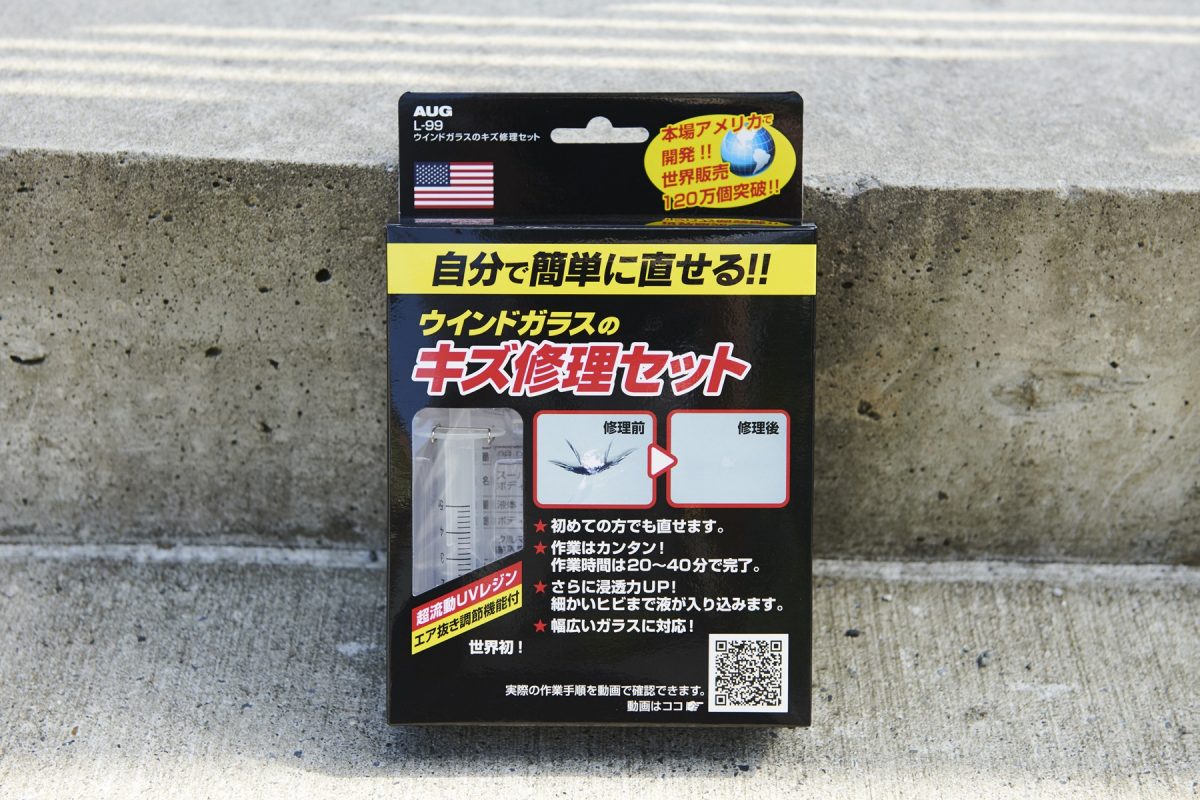 前回私のクルマで使い、綺麗にキズを塞ぐことができたこと、工程を心得ていたこととから、今回もAUG(アウグ)製の「ウインドガラスのキズ修理セット」を使用。価格も3000円前後と良心的で、ネット通販でも購入可能だ。