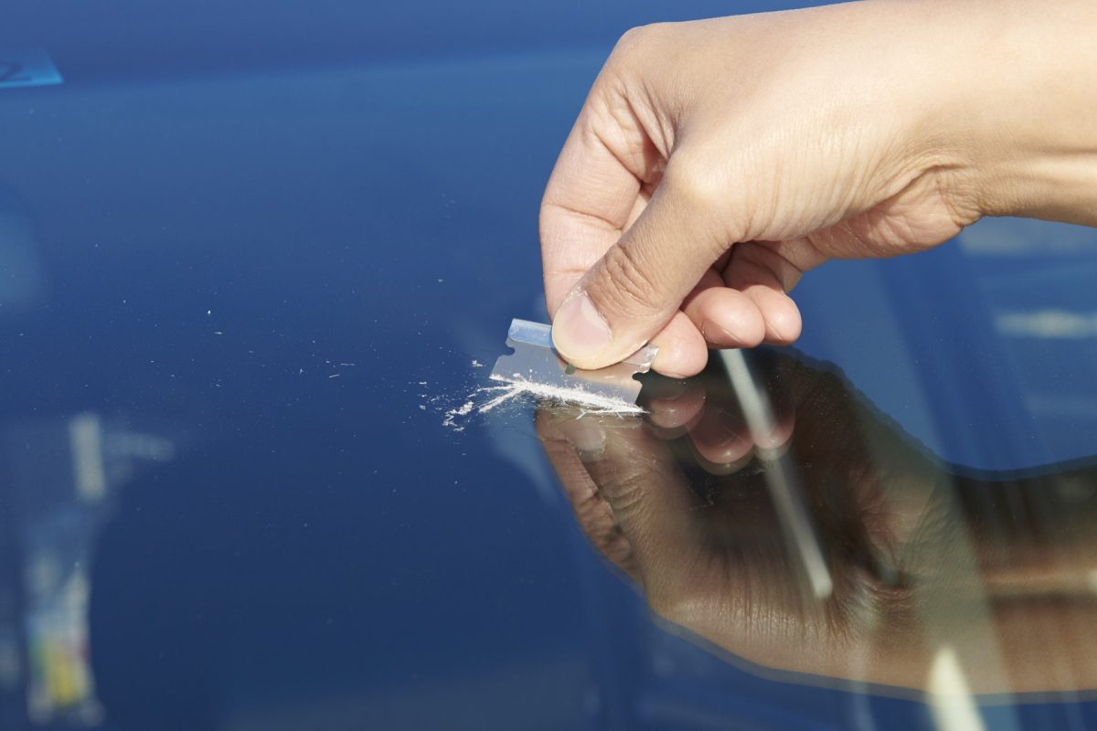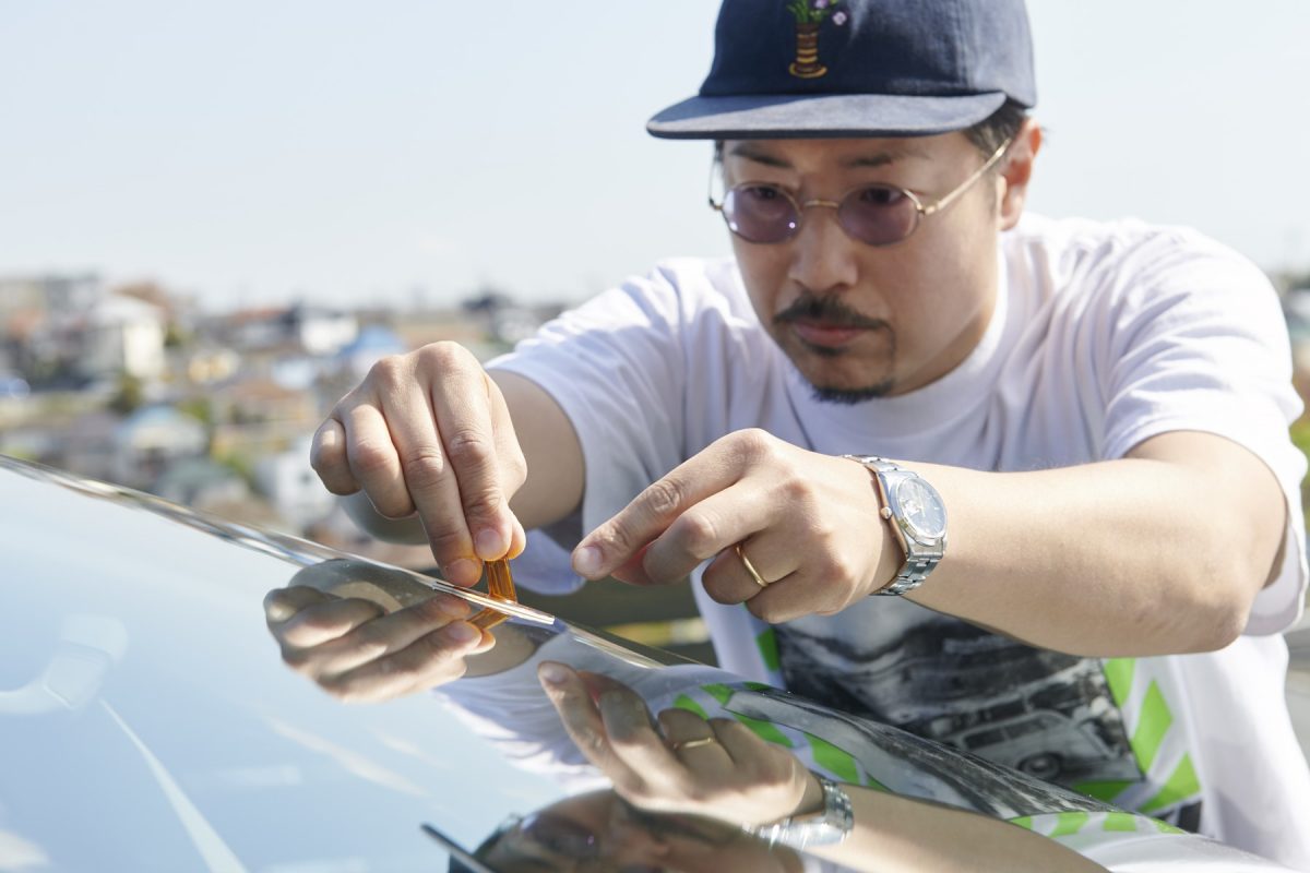飛び石によるキズには、必ずヒットした際の中心点ができる。そこを付属の画鋲で埃を取りながら、程よい力でキズに画鋲の先端を若干差し込んでレジンを浸透しやすくする。やりすぎはもちろん厳禁!