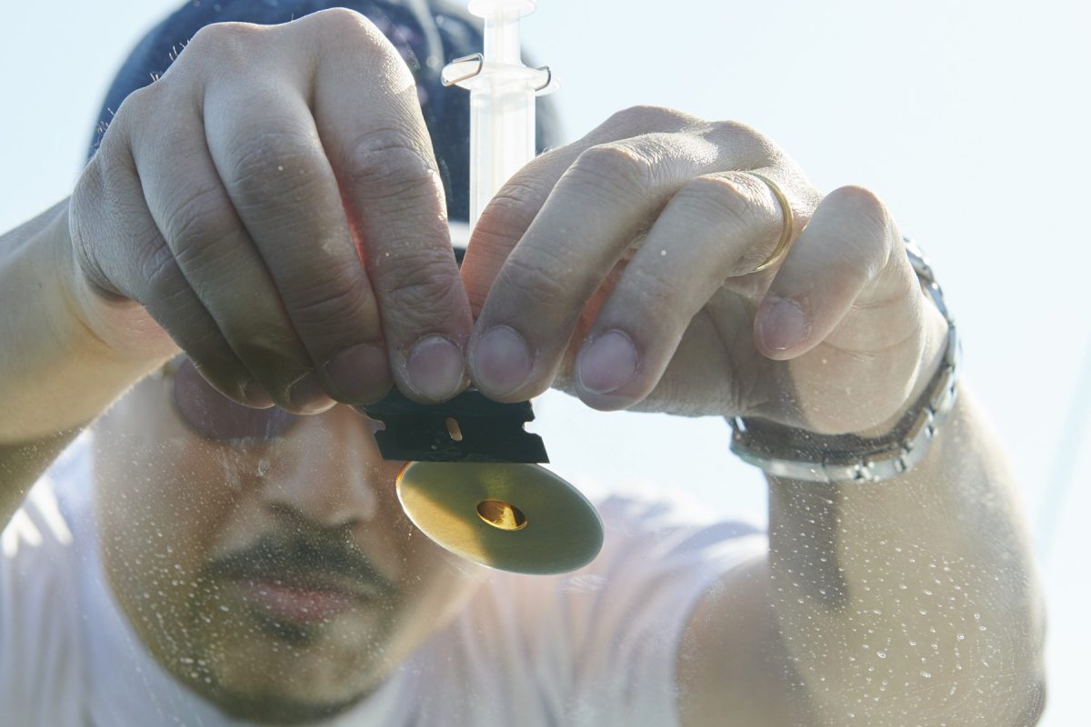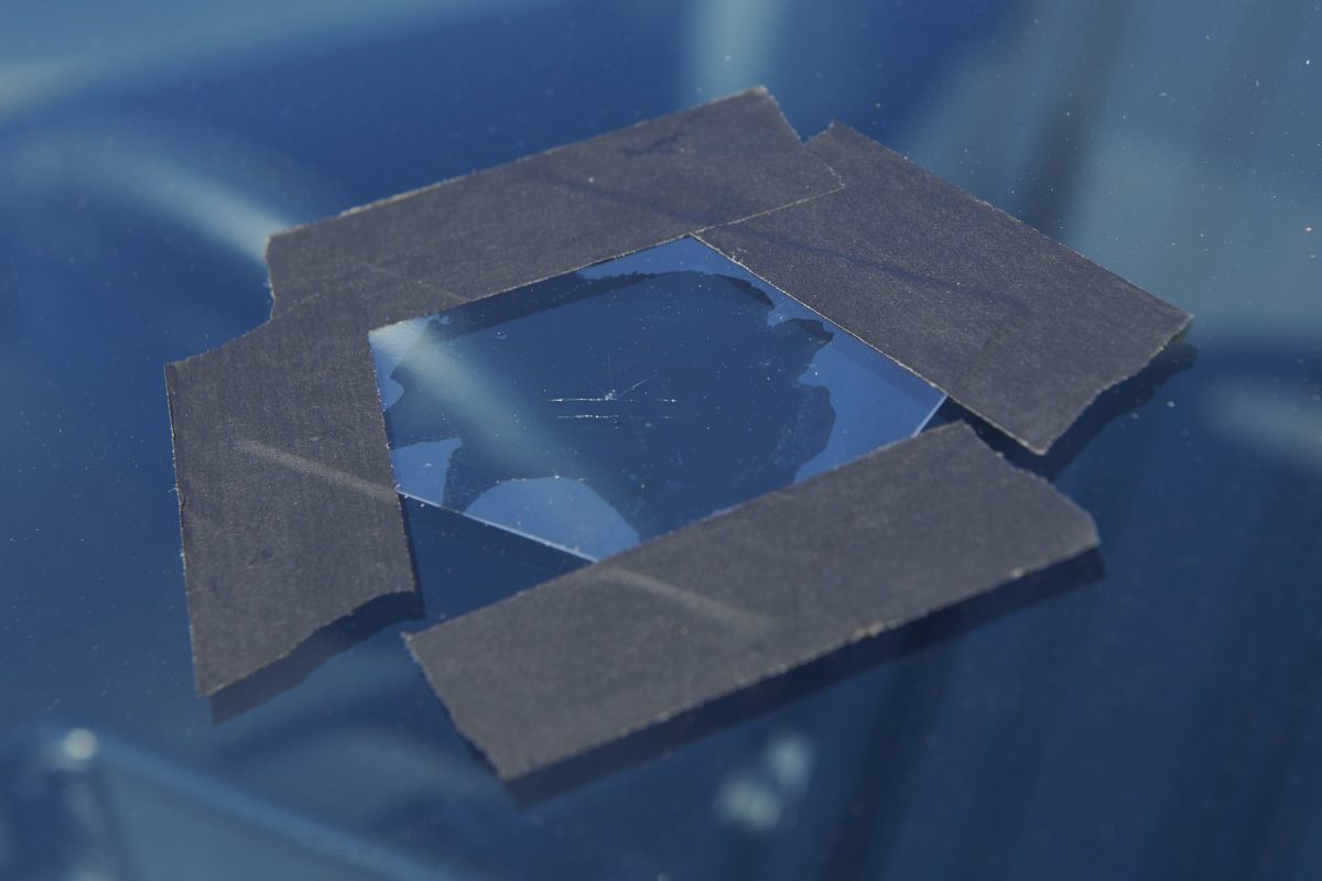 少なくとも説明書に記載されている時間が経ったら、テープを剥がして、ガラス表面で固まったレジンを付属のカミソリで削ぎ落す。