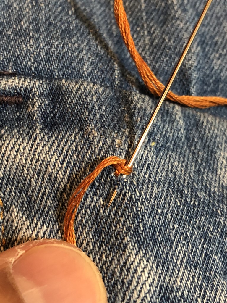 生地から飛び出た針先と生地の間に、手元の糸をクルっと回して針をそのまま引き抜く。これで2つ目の輪ができる。