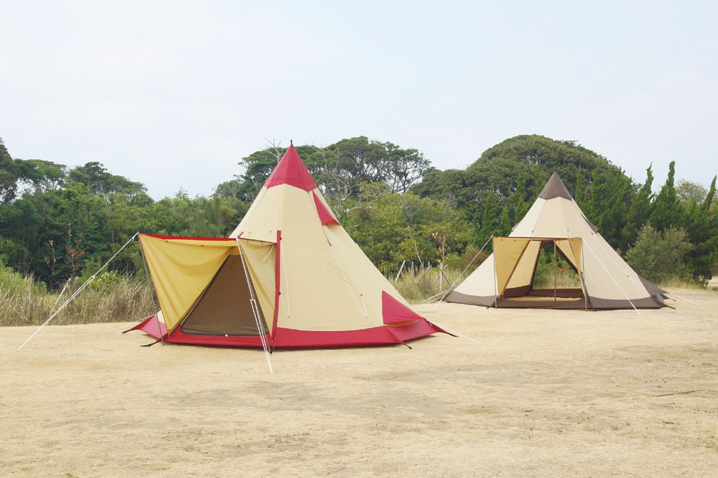 美しいフォルムのティピ型テントで、屋根にヒモで調整できるベンチレーションが付く。またフロアやインナーキャビンを取り付けることができるので、キャンプスタイルによってカスタマイズできる。10万5000円+税、キャ