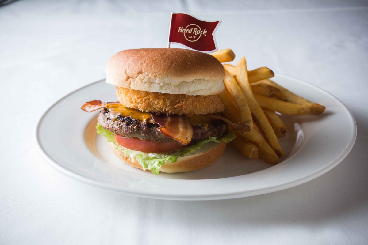 ハンバーガーを主軸としたボリューム満点の料理を、大音量のロックを聴きながら食べるのが醍醐味のハードロックカフェ。店内には名だたるミュージシャン縁のものが展示されているなど、音楽好きにはたまらない店だ。ここで食べておきたいのがレジェンダリーバーガー。240gのビーフパティから溢れ出す肉汁に、チェダーチーズ、ベーコン、フライドオニオンの食感と旨みが絡み合うプレミアムバーガーだ。