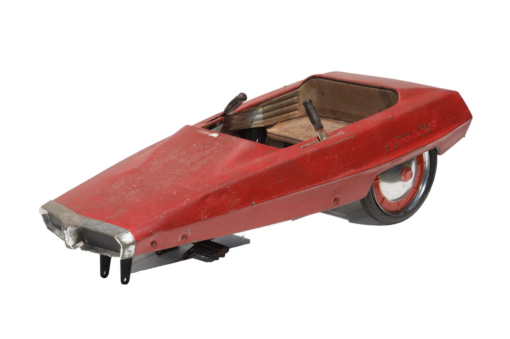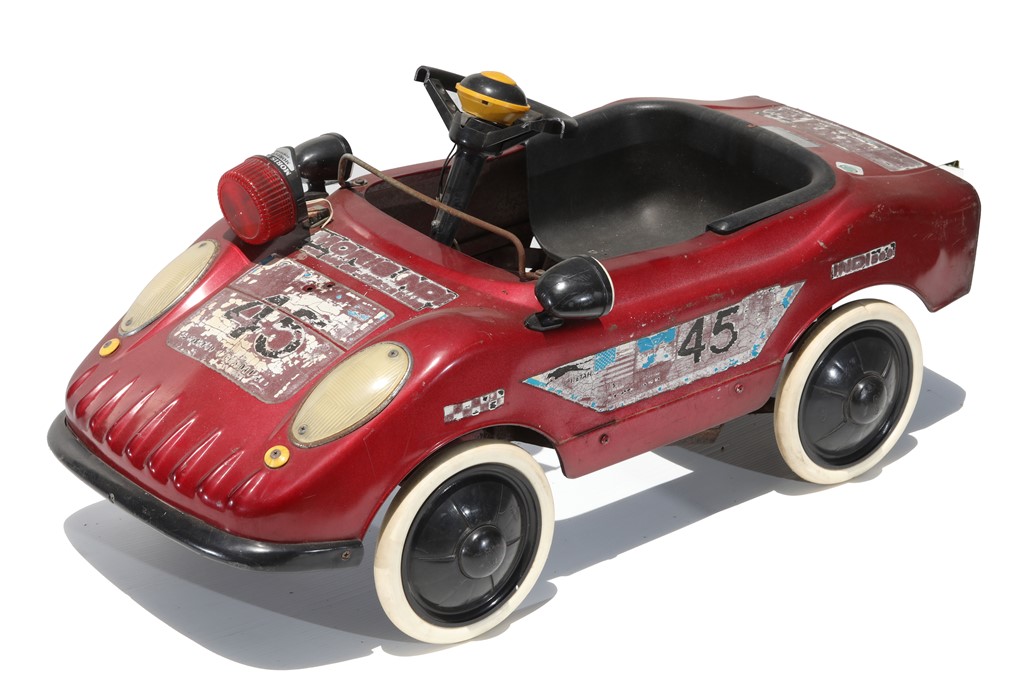 日本のペダルカーの歴史を語る上では外せないのがスモールバード。こちらはボディがプラスチック製というレアなタイプ。未だに人気も高く、デッドストックだと10万円前後、コンディション良好だと4〜5万円程度