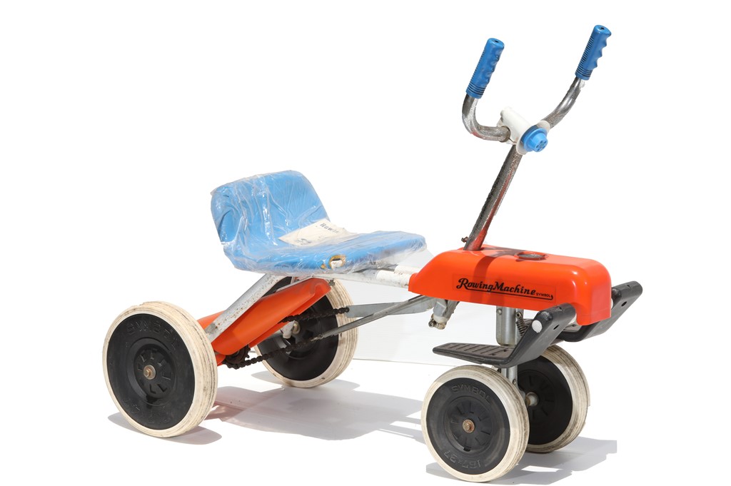 1970年代に入ると様々なスタイルも登場。こちらはハンドル部をボートを漕ぐように前後させることでペダルが周り動くという変わった機構の1台。グリップの形状やカラーもイカす。デッドストック。2万4000円前後