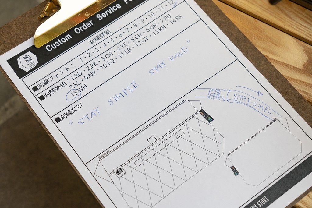 カスタムオーダーの発注シートにいろいろとアイデアを書きこんでいく。刺繍の仕様やコラボ時のタグ位置、使用する部材の色味まで細かく発注していく。デザインテーマは「サーフキャンプ」に決定!