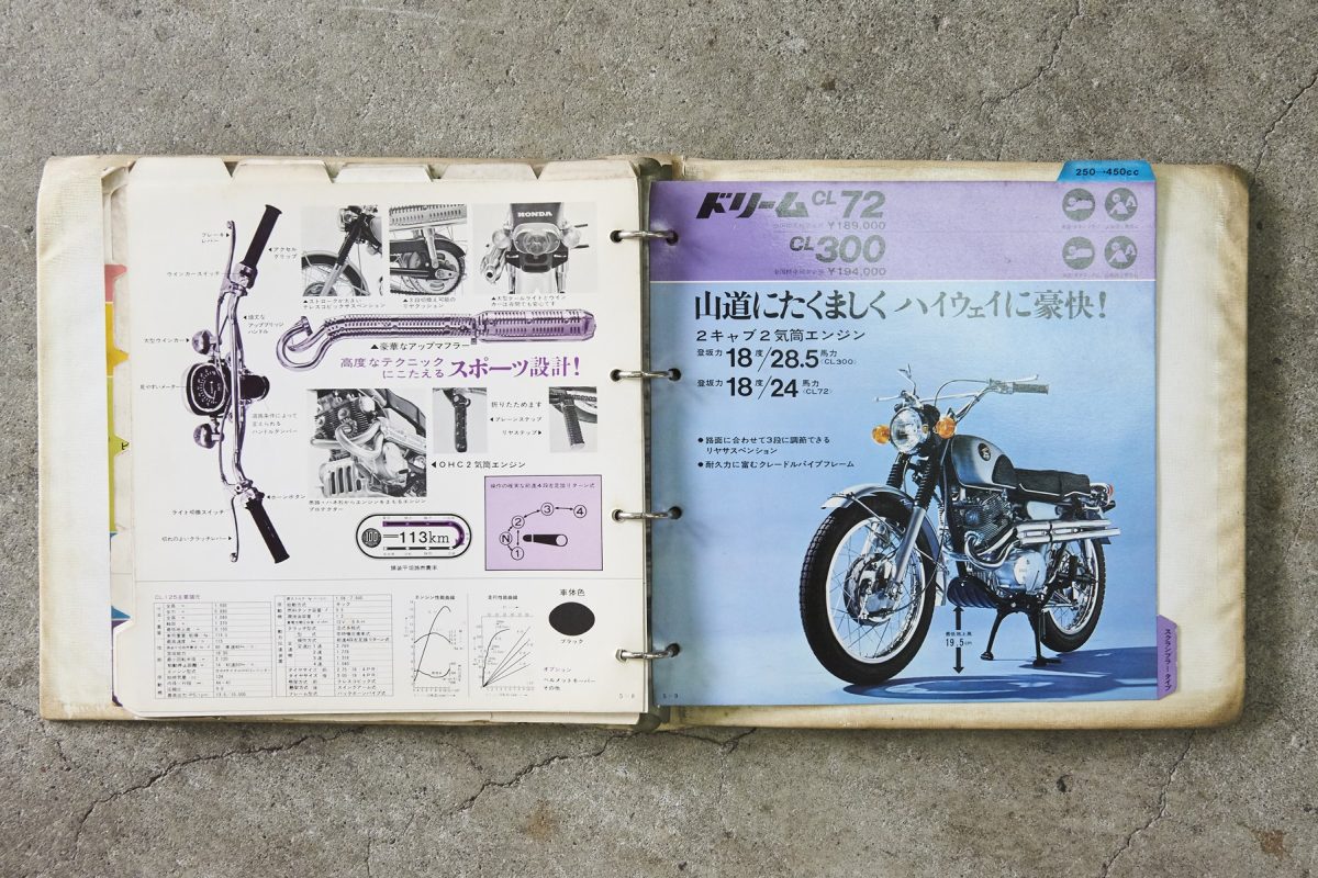 前島さんが所有する当時のホンダのカタログ。CL72はCLシリーズの最高グレードのモデルだった。発売当初のカラーはブラックとレッドの2色。その後ブルーもラインナップに加わった。