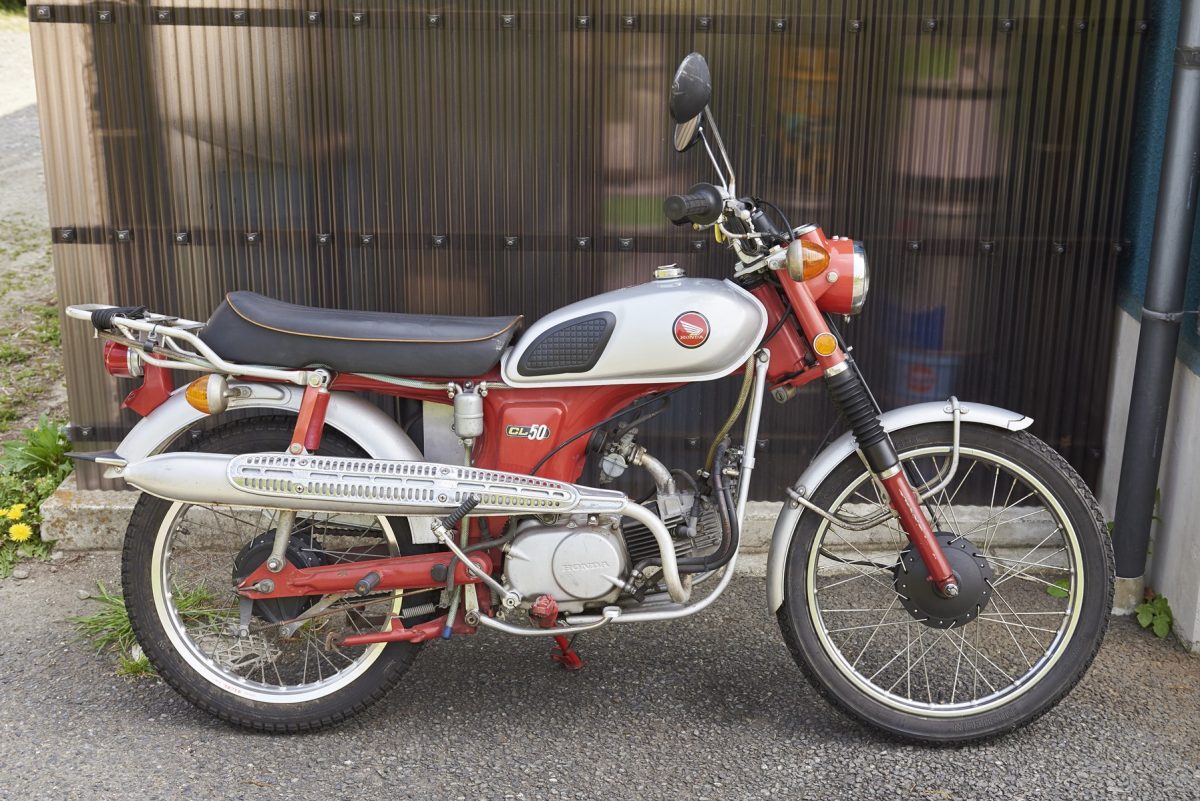1967年製のホンダCL50。快適に走れるように90㏄にボアアップしている。前島さんによる整備済みの車両でグッドコンディション。28万円。