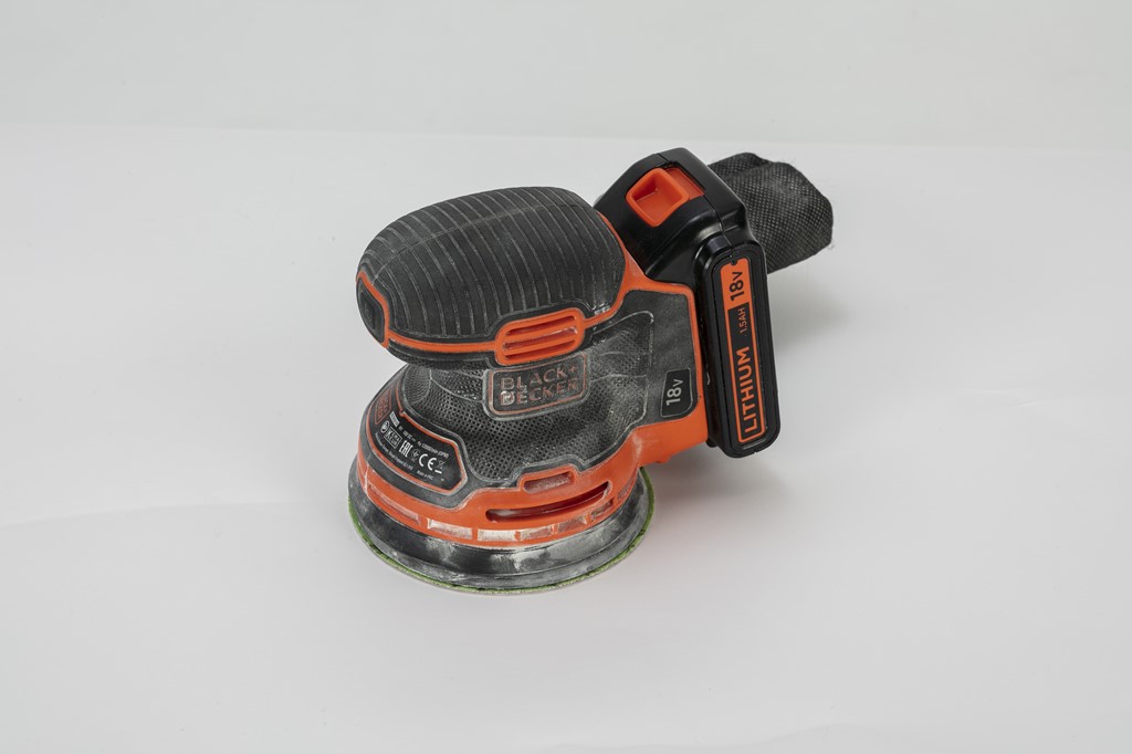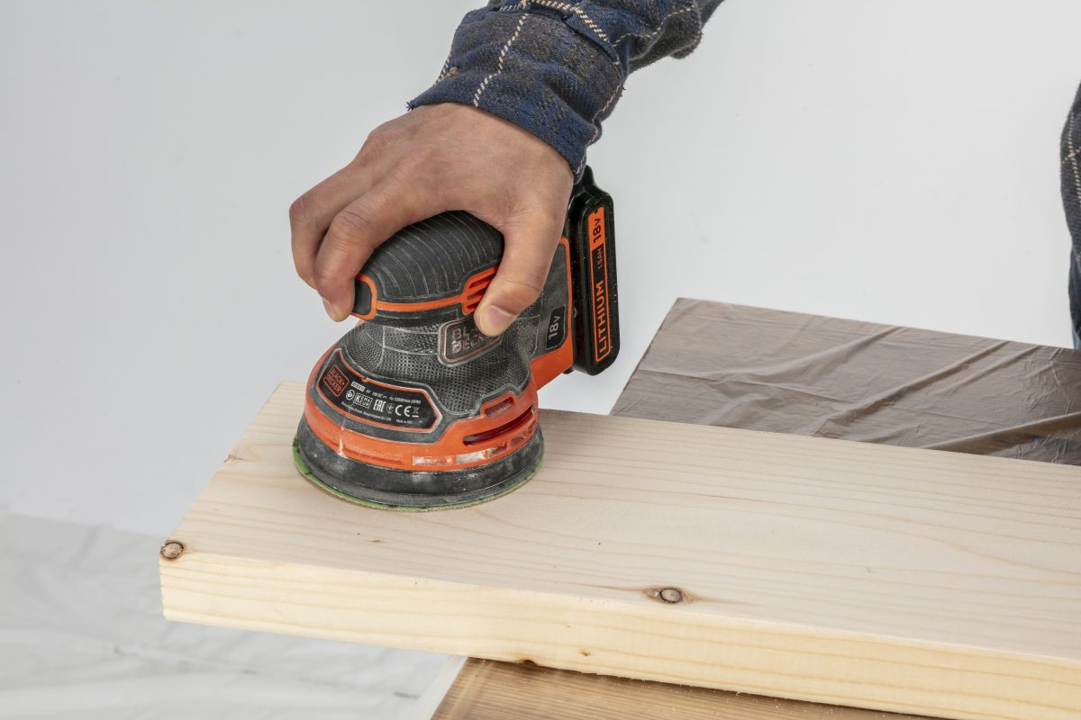 木材にワックスを塗る前にサンディングすることで、表面が滑らかになるだけでなく、ワックスが浸透しやすくなる。今回は円形が便利。紙やすりで行うよりずっと時間短縮に。