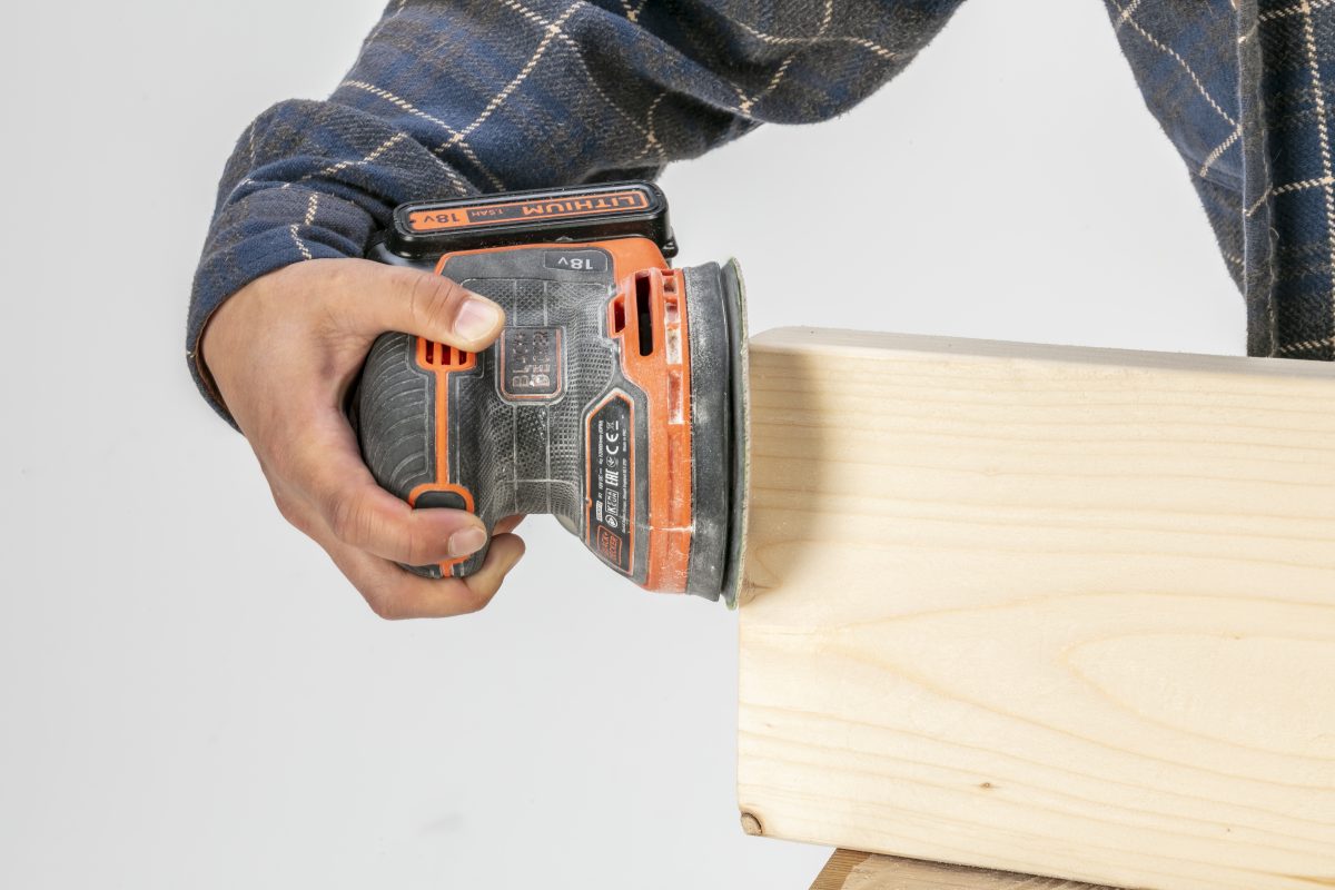まず2×8材の表面とサイドをサンディングして滑らかに仕上げる。また使い込まれた雰囲気を出すため、角もサンディングして丸みをつけるのもポイント。