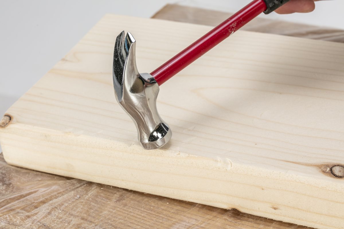 ハンマーやヤスリを使って木材にあらかじめキズを付けておくと、キズにワックスが入り込み、より古材っぽい仕上がりになる。