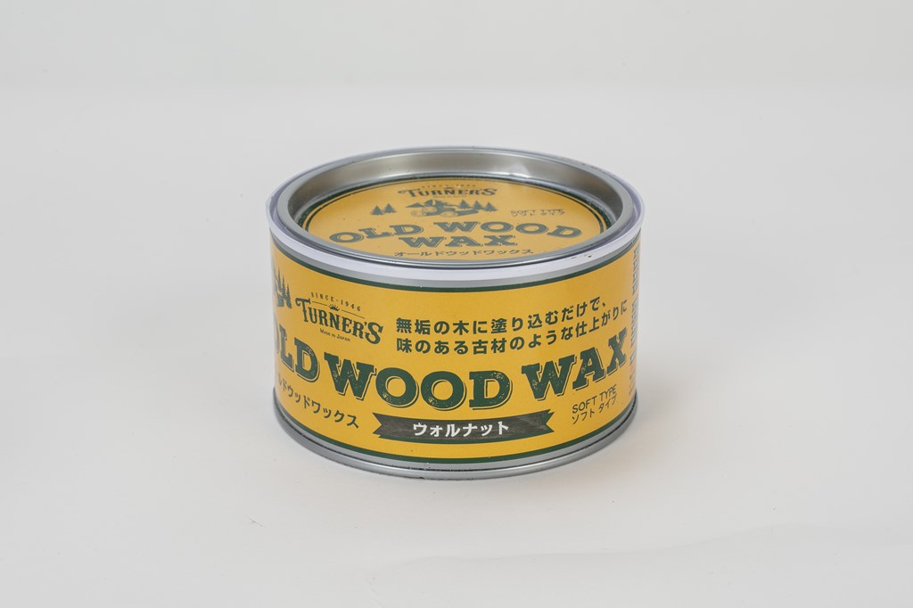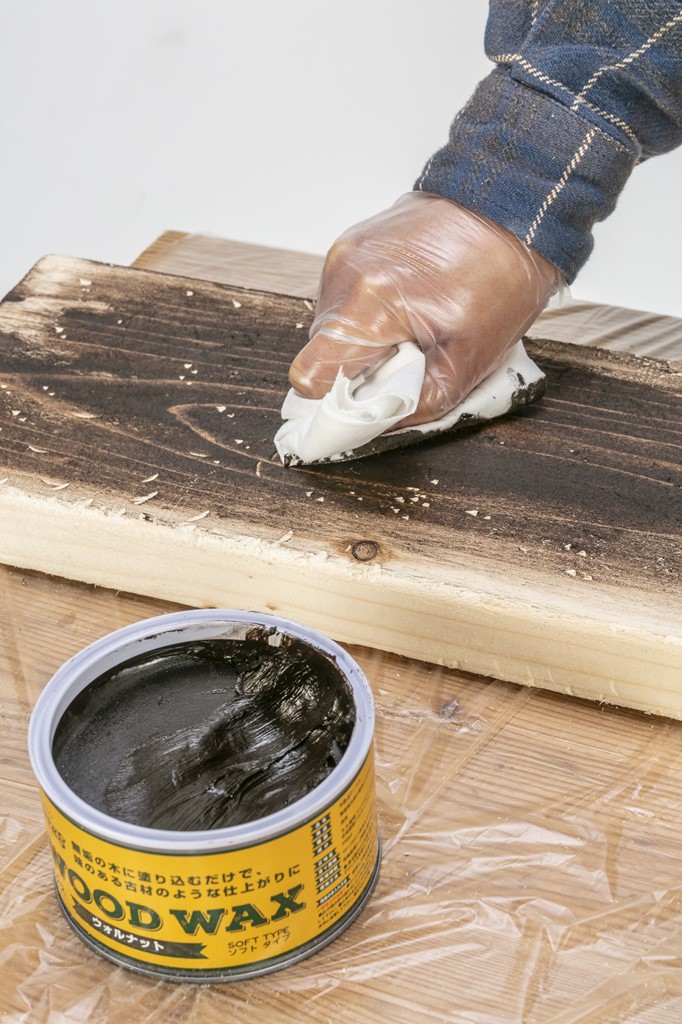汚れ加工をする前に木材に塗るワックス。これを塗るだけで古材のような風合いに仕上がる。塗布するときに使うウエスも準備。350㎖約3300円