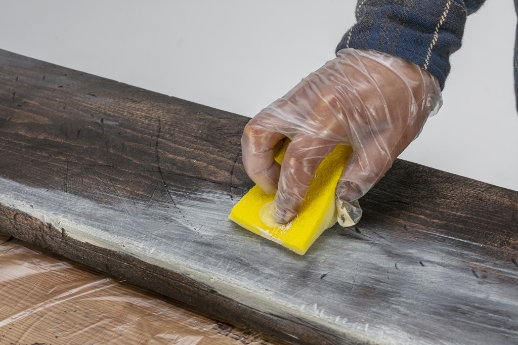 余分なワックスをウェスで拭き取り乾燥させたら、ダストメディウムを全体に塗っていく。ムラ感を出すのと、角を重点的に塗るのがポイントだ。