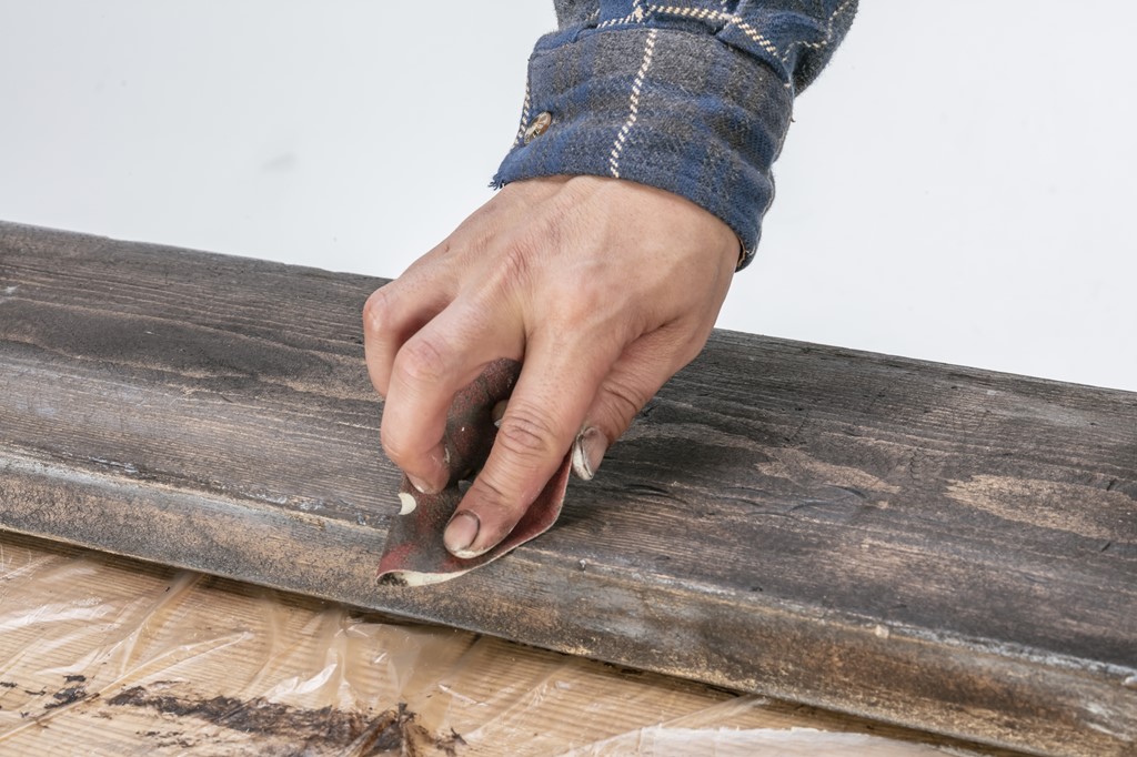 再び乾燥させたら、紙やすりで軽くサンディングして汚れを調整すると、よりムラ感が出て使い込まれた雰囲気になる。