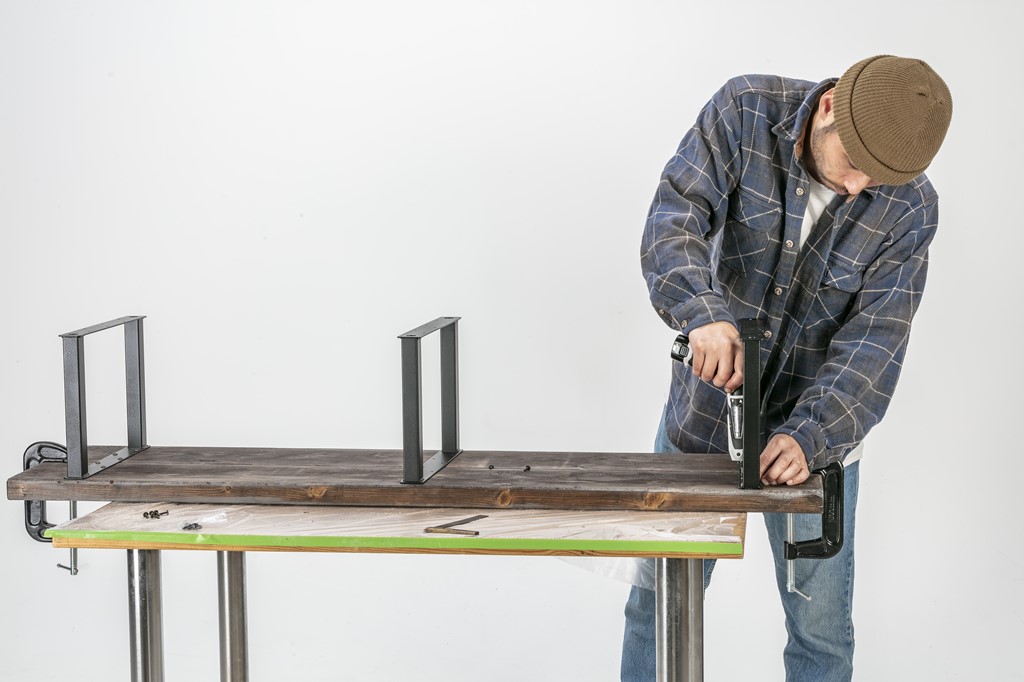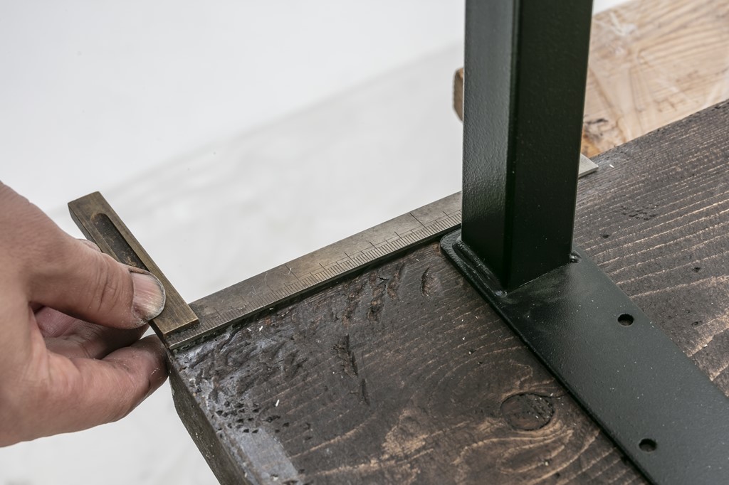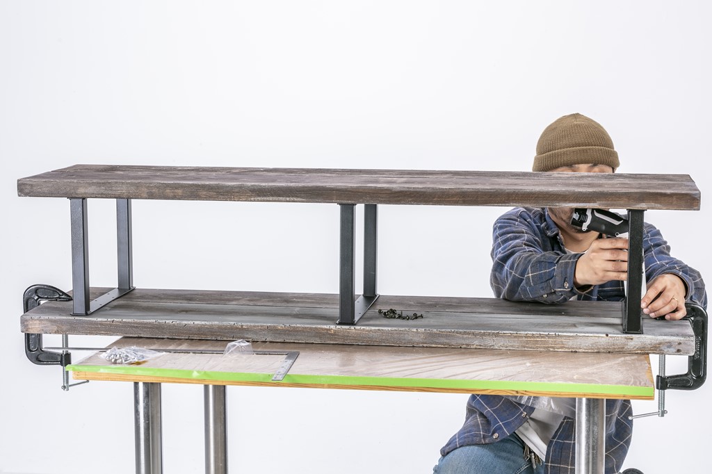 板を2枚並べアイアンスクエアブラケットで板を繋げる。端から10㎝の箇所にビスを打ちしっかり固定する。
