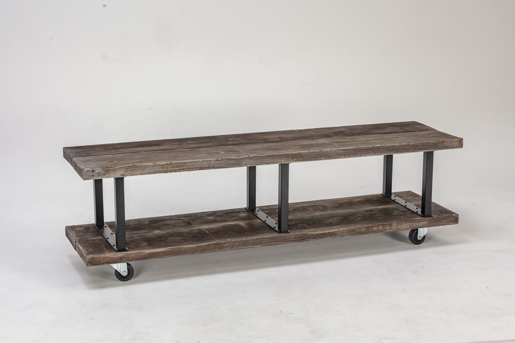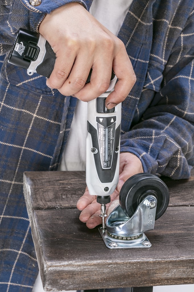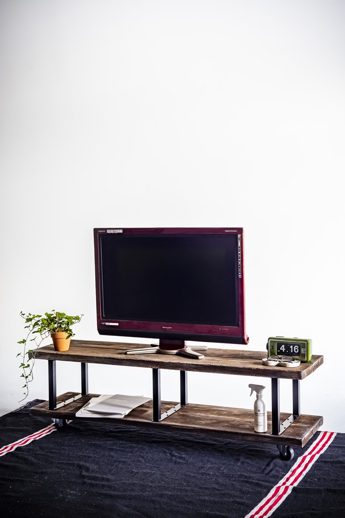 風合いの付け方次第で、使い古された感じから、長い間放置された板の感じまでいかようにも仕上げられる。ここはアイアンを落とした跡、ここはハンマーでぶつけた跡……みたいに、妄想しながらエイジングしていくのも面白い。テレビのサイズに合わせて木材の長さとブランケット、キャスターの数を調整すれば、自分好みの世界にひとつのテレビボードの完成だ。