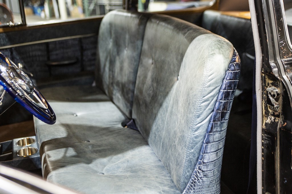 手染めしたアリゲーターとムーアアンドシャイルズ製レザーのコンビで張り替えたシートはオリジナルの雰囲気を壊さないよう、褪色しているグラデーションもポイント。あくまでオリジナルをリスペクトしている。