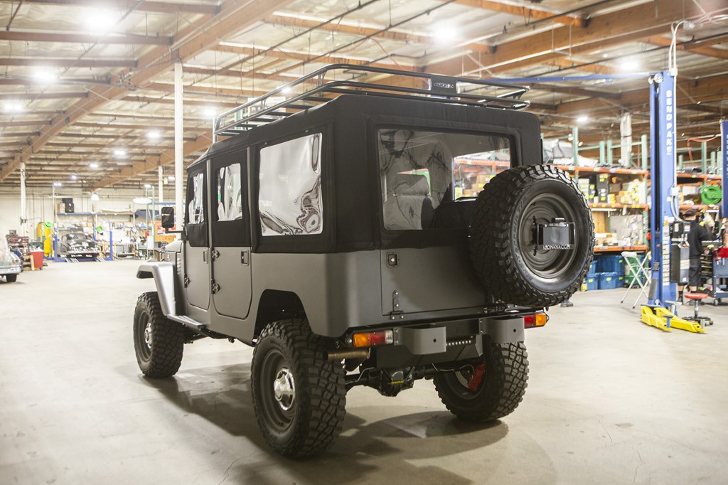 リアからの眺めはオリジナルのFJ らしさそのままをキープしている。ボディカラーのパウダーコートによるグレーは、原野よりも都会を走っている姿がよく似合うアーバンなカラー。