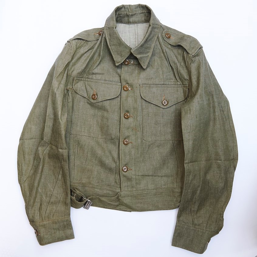 デッドストックの1950年代のブリティッシュアーミーのグリーンデニムジャケットは、滅多に出てくることのない超レア物。ボタン類もオリジナルである。2万1780円