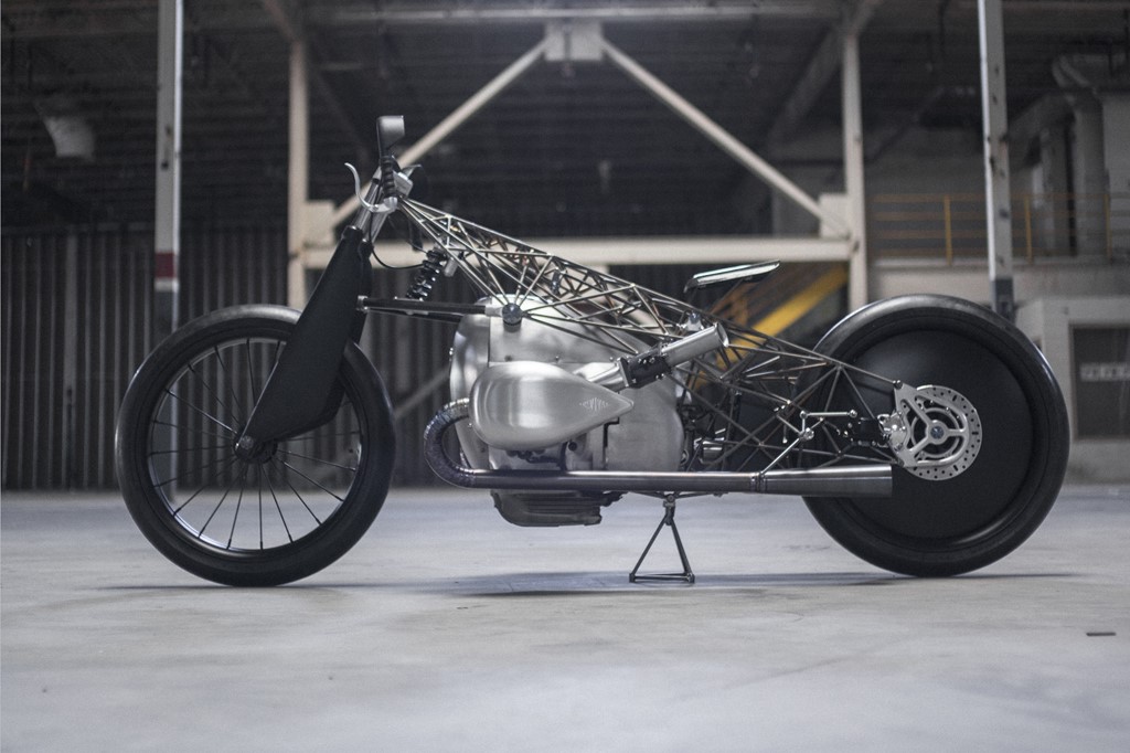 BMWの次期新型車両に搭載されるエンジンを搭載し、ボディデザインの概念を覆す一台に仕上げたリバイバルサイクルズ。モデル名の通り“鳥かご” をイメージした細いトラスフレームはどの角度からもエンジンが見えるように製作。燃料タンクはエンジン後方に配置している。
