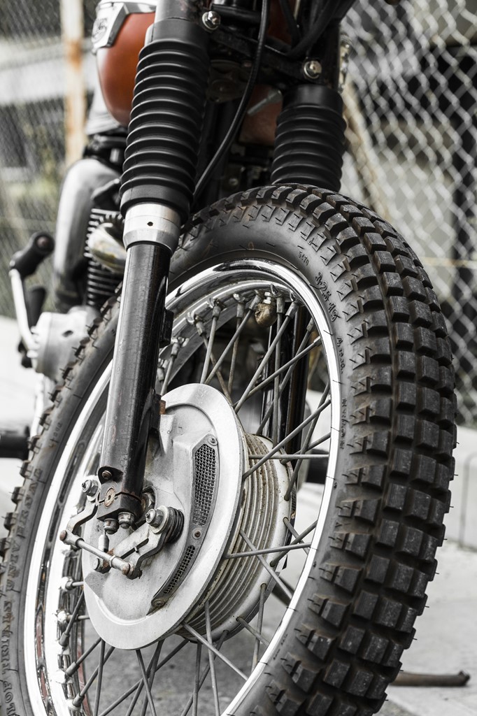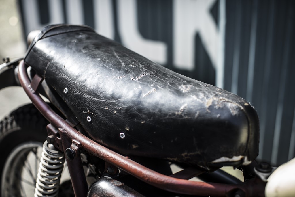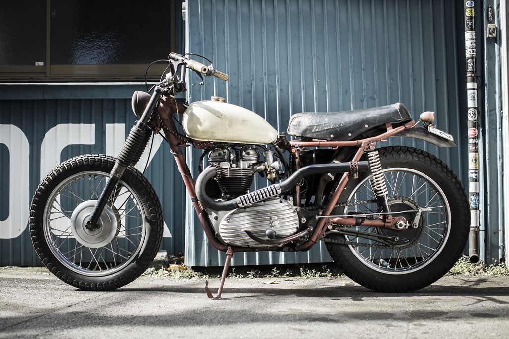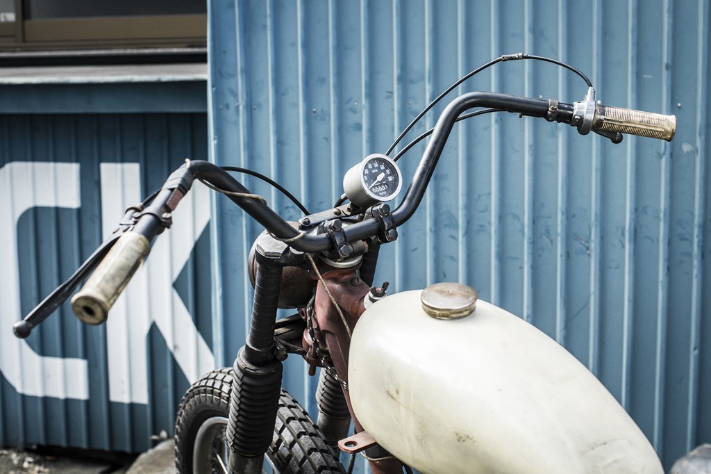 スイングアームフレーム×ユニットモーターの特性を活かしたダートスタイル。アップハンドル、アップマフラーはアメリカンなスクランブラーの象徴的なディテールだ。当時のレーシングパーツを取り入れるだけでなく、プライマー塗装のフレームがやれた外装と相まって、草レースに参戦していた車両のようなリアルな雰囲気に