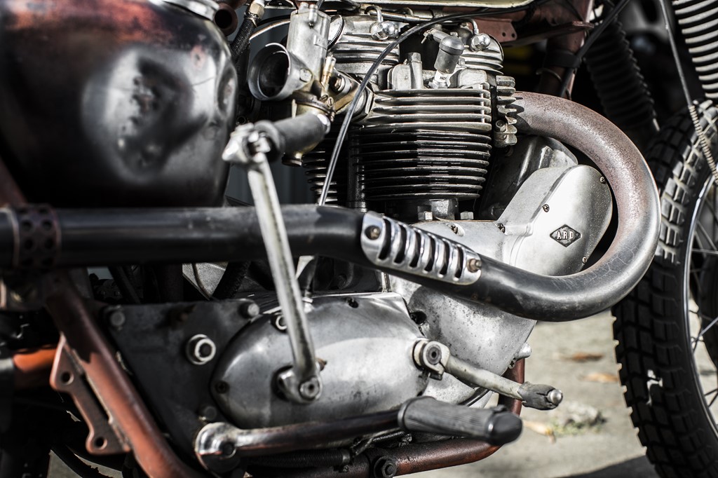 心臓部はツインキャブヘッドを備えるボンネビルにハイコンプピストンをインストールした程よくホットな仕様。カムカバーとマグネトーのステーが一体になったARDマグネトーは当時のレースで使用されていたレーシングパーツだ。