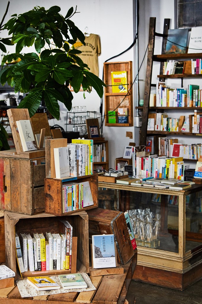 外観からはとても本屋さんには見えないこのお店。工場跡地をそのまま再利用した無機質な建物に、使い込まれた旧い木箱や机の引き出しをランダムに組み合わせて書棚を作ったユニークな空間だ。