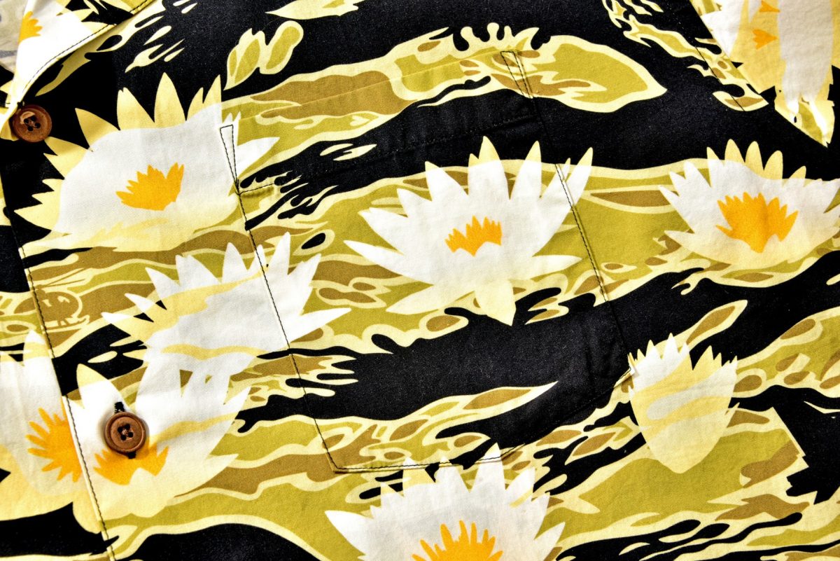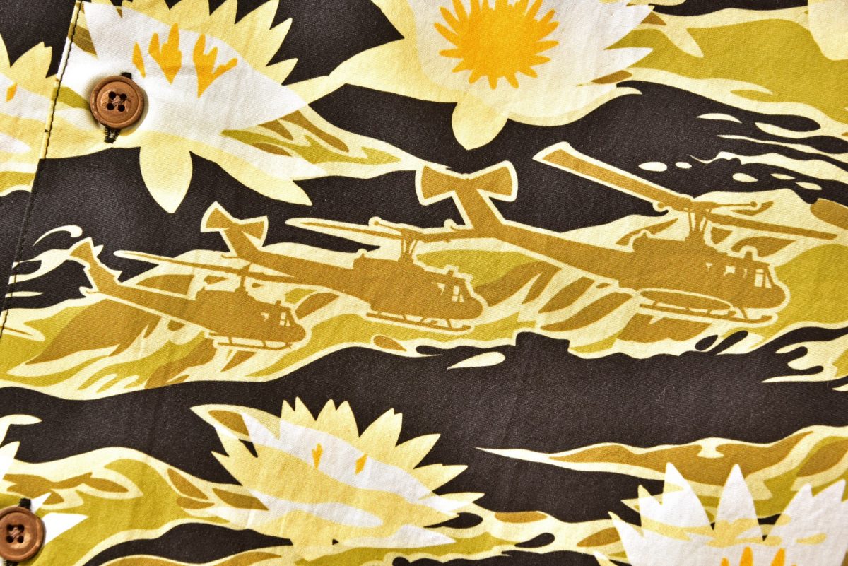……という前置きからの「オッティギア」の2020年春夏新作を紹介。2004年に米国ニューヨークでスタートしたタクティカルブランド「オッティギア」が、ナイフなどのタクティカルギアブランド「バウィダマン」とタッグを組み、映画『地獄の黙示録』の40周年を記念し、完成まで1年以上かけて製作したタイガーストライプ柄のアロハシャツ。柄に隠されたデザインは、まさに「地獄の黙示録」の世界観を再現する!