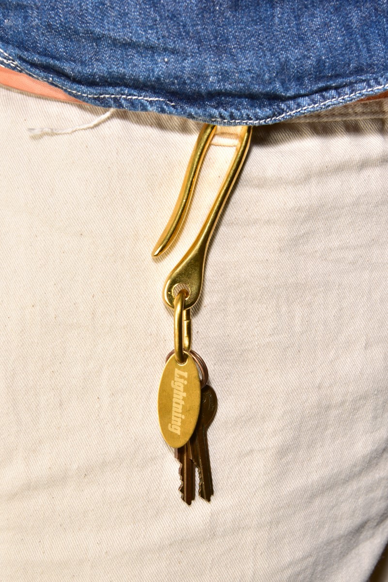 プロダクツの名前の通りのもっとも基本的な使い方。フック状になっているので、ポケットに入れておいても、ベルトループやベルトに引っかけても使うことができる。写真は同じく真鍮製のリングを追加してキーを装着。昔ながらの真鍮色が出た鍵との相性は抜群だ