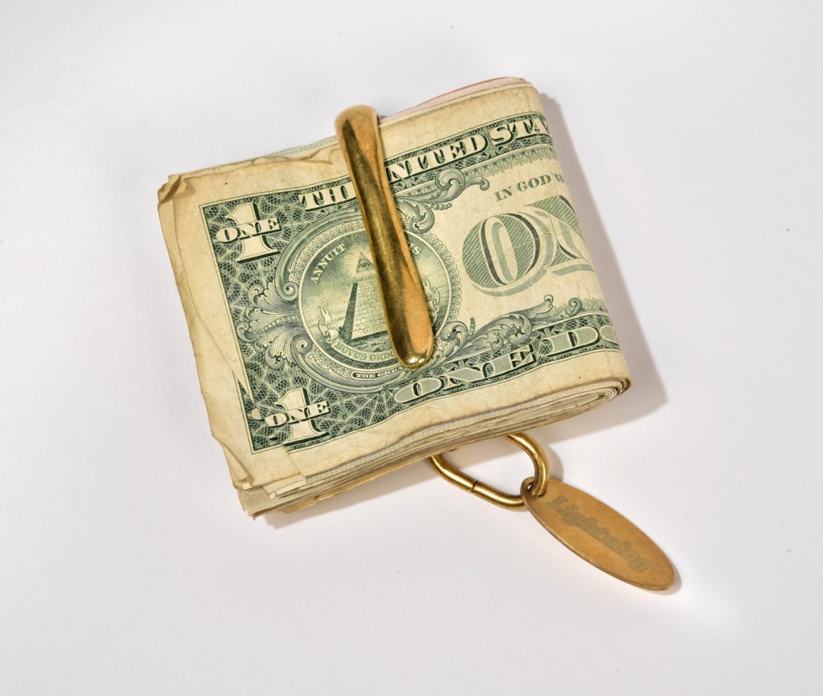 真鍮のフック部分の隙間を使ってマネークリップに。ただしフックの隙間がけっこうあるので、常にそこそこの枚数の紙幣を挟まないと外れてしまうというウイークポイントも。つまりいつもたっぷりの紙幣を持ち歩いている人限定の使い方。支払時に真鍮がキラリと光る。