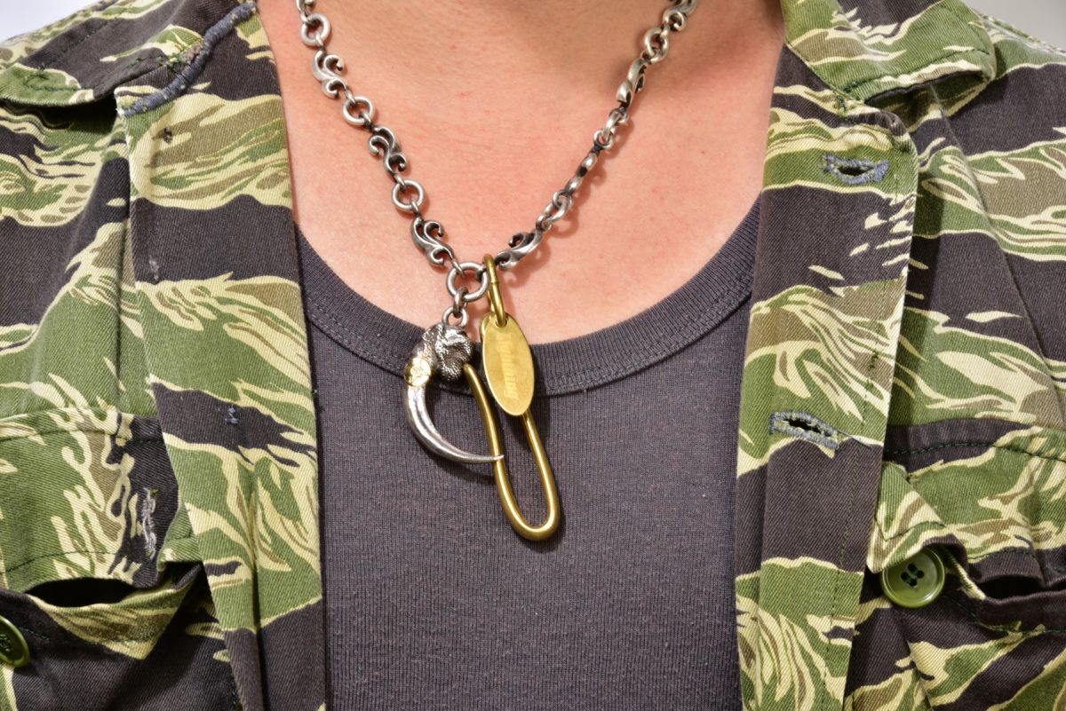 こいつはペンダントヘッドにちょうどいいと荒業を披露するモヒカン小川。でも意外と違和感なく収まっているからアイデアの勝利。コツはヘッドに負けないぐらい、少し太めのチェーンを合わせると違和感なくコーディネイトできる。ゴールドのアクセサリーとも相性良し。