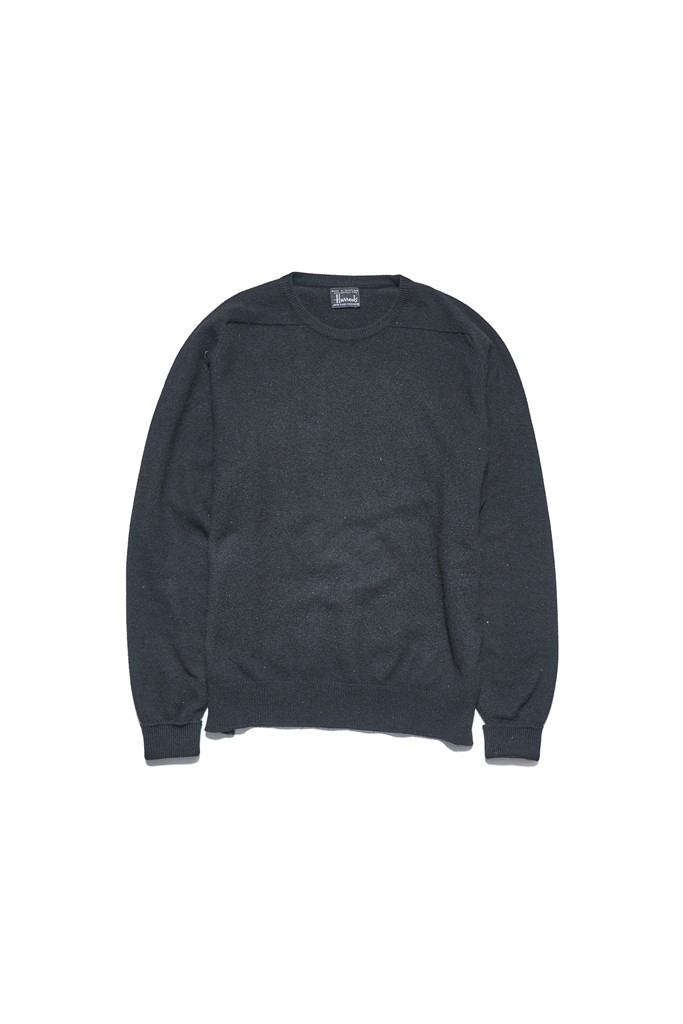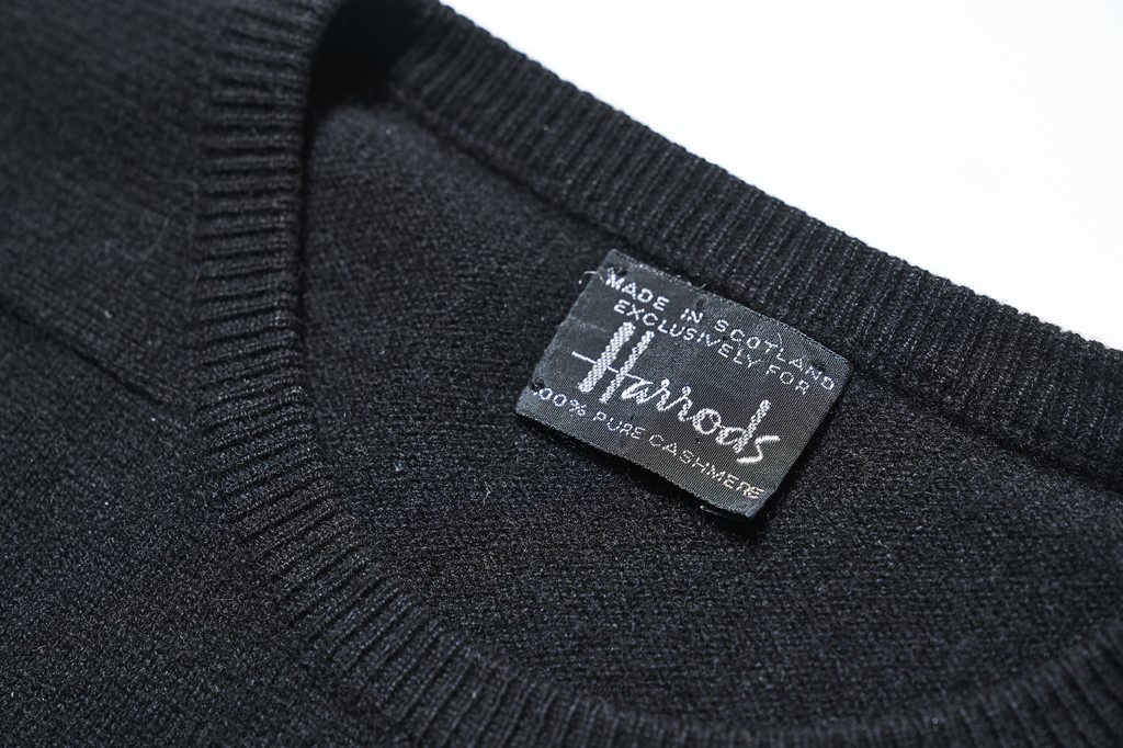 あったら買っておきたい筆頭株が、スコットランド製の黒いカシミアニット。これは1970年代のハロッズ。特にクルーネックは少ない。大嶋さん私物。